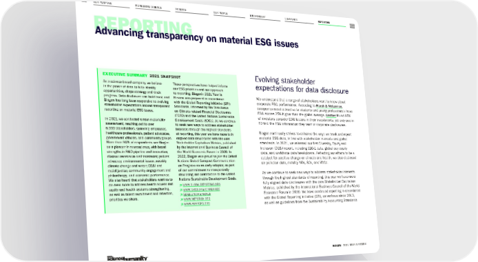 OUR PURPOSE PIONEERING SCIENCE 115 BIOGEN 2021 YEAR IN REVIEW PATIENTS OUR PEOPLE ENVIRONMENT COMMUNITY REPORTING REPORTING Advancing transparency on material ESG issues EXECUTIVE SUMMARY 2021 SNAPSHOT As a science-based company, we believe in the power of data to help identify opportunities, shape strategy and track progress. Data disclosure can build trust, and Biogen has long been responsive to evolving stakeholder expectations around transparent reporting on material ESG issues. In 2021, we conducted a new materiality assessment, reaching out to over 5,000 stakeholders, spanning employees, healthcare professionals, patient advocates, government officials, and community groups. More than 94% of respondents see Biogen as a pioneer in neuroscience, with broad strengths in R&D pipeline and innovation; disease awareness and treatment; patient advocacy; environmental issues, notably climate change and water; DE&I and racial justice; community engagement and philanthropy; and economic performance. We also heard that stakeholders want us to do even more to address health access and equity and health systems strengthening, as well as talent recruitment and retention, priorities we share. Those perspectives have helped inform our ESG priorities and our approach to reporting. Biogen’s 2021 Year in Review was prepared in accordance with the Global Reporting Initiative (GRI) Standards, informed by the Task Force on Climate-related Financial Disclosures (TCFD) and the United Nations Sustainable Development Goals (SDGs). As we continue to seek new ways to address stakeholder interests through the highest standards of reporting, this year we have more fully aligned data disclosures with the core Stakeholder Capitalism Metrics, published by the International Business Council of the World Economic Forum in 2020. In 2022, Biogen was proud to join the United Nations Global Compact Communication on Progress as an early adopter, as part of our commitment to transparently disclosing our contribution to the United Nations Sustainable Development Goals. Þ WWW.GLOBALREPORTING.ORG Þ WWW.SASB.ORG/STANDARDS Þ SDGS.UN.ORG/GOALS Þ WWW.WEFORUM.ORG Þ WWW.FSB-TCFD.ORG Evolving stakeholder expectations for data disclosure We understand that a range of stakeholders want to know about corporate ESG performance. According to Marsh & McLennan , companies most attractive to students and young professionals have ESG scores 25% higher than the global average. Gartner found 85% of investors consider ESG factors in their investments, yet only one in 10 find the ESG information they want in corporate disclosures. Biogen continually strives to enhance the ways we track and report material ESG data, in line with stakeholder interests and global standards. In 2021, we released our first Diversity, Equity and Inclusion (DE&I) report, including EEO-1 data, global pay equity data, and workforce data breakdowns. Reflecting our efforts to be a catalyst for positive change on climate and health, we also disclosed air pollution data, notably NOx, SOx, and VOCs. As we continue to seek new ways to address stakeholder interests through the highest standards of reporting, this year we have more fully aligned data disclosures with the core Stakeholder Capitalism Metrics, published by the International Business Council of the World Economic Forum in 2020. We have continued reporting in accordance with the Global Reporting Initiative (GRI), as we have since 2013, as well as guidelines from the Sustainability Accounting Standards