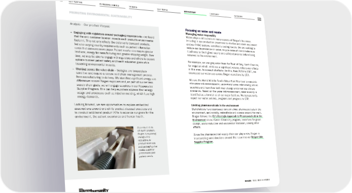 OUR PURPOSE PIONEERING SCIENCE COMMUNITY REPORTING 93 PROMOTING ENVIRONMENTAL SUSTAINABILITY BIOGEN 2021 YEAR IN REVIEW PATIENTS OUR PEOPLE ENVIRONMENT – Engaging with regulators around packaging requirements – we found that the end customer location impacts each product’s environmental footprint. This not only reflects the distance to transport products, but also varying country requirements such as patient information cards that consume more paper. Patient inserts also require greater land use, energy for manufacturing and greater shipping weight. Over time, we may be able to engage with regulators and others to explore options to meet patient safety and health education goals while lessening environmental impacts. – Working across the value chain – biologics are temperature sensitive and require a secure cold chain management process from manufacturing to delivery. We identified significant energy use differences across Biogen suppliers and, as part of our net zero supply chain goals, we will engage suppliers in our Responsible Supplier Program. This can help suppliers address their energy usage and processes such as injection molding, which have high energy demands. Looking forward, we see opportunities to explore embedded assumptions around end-of-life product disposal practices and to conduct additional product LCAs to advance our goals for the environment, the patient experience and human health. Focusing on water and waste Managing water responsibly Water plays a critical role in many aspects of Biogen’s business, including in our production processes to sterilize and clean equipment and our HVAC system, specifically cooling towers. We are working to reduce our dependence on water, recycle more of it and make sure it adheres to the highest quality and safety standards before being returned to the environment. For example, we use grey water from the Town of Cary, North Carolina, for irrigation which, while not a significant volume, reflects our efforts in this area. As a result of efforts like this, from 2019 to 2021, we decreased our water use across Biogen operations by 15%. We use the World Wildlife Fund’s Water Risk Filter tool to complete site water risk assessments, understand water risks among critical suppliers and learn how both may change under various climate scenarios. Based on the water risk assessment, water scarcity is identified as a low risk at all our major facilities. We transparently report our water policies, programs and progress to CDP. Limiting pharmaceuticals in the environment Stakeholders have expressed concern about pharmaceuticals in the environment, and notably, watersheds and oceans around the world. Biogen follows the EU’s Strategic Approach to Pharmaceuticals in the Environment via our Green Chemistry program, incentives for green design, waste reduction and wastewater treatment, among other efforts. Since the pharmaceutical supply chain can play a role, Biogen is incorporating considerations around this issue into our Responsible Supplier Program . As a result of its life cycle analysis, Biogen is exploring changes like reductions in product materials and packaging that meets customer preferences and patient needs. Analysis – Our product lifecycle