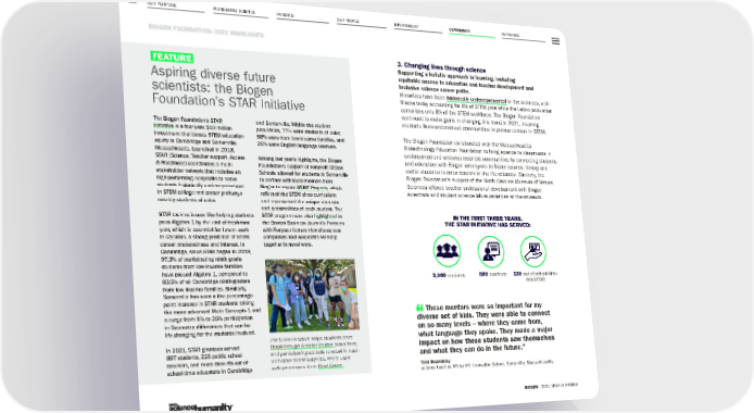 OUR PURPOSE PIONEERING SCIENCE REPORTING 111 BIOGEN FOUNDATION: 2021 HIGHLIGHTS BIOGEN 2021 YEAR IN REVIEW PATIENTS OUR PEOPLE ENVIRONMENT COMMUNITY 3. Changing lives through science Supporting a holistic approach to learning, including equitable access to education and teacher development and inclusive science career paths. Minorities have been historically underrepresented in the sciences, with Blacks today accounting for 6% of STEM jobs while the Latino population comprises only 8% of the STEM workforce. The Biogen Foundation continued to make gains in changing this trend in 2021, inspiring students from underserved communities to pursue careers in STEM. The Biogen Foundation collaborated with the Massachusetts Biotechnology Education Foundation to bring science to classrooms in underserved and underrepresented communities by connecting students and educators with Biogen employees to foster science literacy and excite students to enter careers in the life sciences. Similarly, the Biogen Foundation’s support of the North Carolina Museum of Natural Sciences offered teacher professional development with Biogen scientists and student science lab experiences at the museum. FEATURE Aspiring diverse future scientists: the Biogen Foundation’s STAR Initiative The Biogen Foundation’s STAR Initiative is a four-year, $10 million investment that boosts STEM education equity in Cambridge and Somerville, Massachusetts. Launched in 2018, STAR (Science, Teacher support, Access & Readiness) coordinates a multi- stakeholder network that includes six high-performing nonprofits to serve students historically underrepresented in STEM college and career pathways – notably, students of color. STAR tackles issues like helping students pass Algebra 1 by the end of freshman year, which is essential for future work in Calculus, a strong predictor of STEM career preparedness and interest. In Cambridge, since STAR began in 2018, 97.3% of participating ninth grade students from low-income families have passed Algebra 1, compared to 83.5% of all Cambridge ninth-graders from low-income families. Similarly, Somerville has seen a five percentage- point increase in STAR students taking the more advanced Math Concepts 1 and a surge from 8% to 20% participation in Geometry, differences that can be life-changing for the students involved. In 2021, STAR grantees served 897 students, 226 public school teachers, and more than 85 out-of- school-time educators in Cambridge and Somerville. Within the student population, 77% were students of color, 58% were from low-income families, and 26% were English language learners. Among last year’s highlights, the Biogen Foundation’s support of nonprofit Citizen Schools allowed for students in Somerville to partner with local mentors from Biogen to create WOW! Projects, which reflected the STEM class curriculum and represented the unique interests and personalities of each student. The STAR program was also highlighted in the Boston Business Journal’s Partners with Purpose feature that showcases companies and nonprofits working together in novel ways. The STAR Initiative helps students from Breakthrough Greater Boston (seen here) and participating schools to excel in math and other STEM subjects. Photo used with permission from Root Cause. These mentors were so important for my diverse set of kids. They were able to connect on so many levels – where they came from, what language they spoke. They made a major impact on how these students saw themselves and what they can do in the future.” Tara Beardsley science teacher, Winter Hill Innovation School, Somerville, Massachusetts IN THE FIRST THREE YEARS, THE STAR INITIATIVE HAS SERVED: 3,000 students 500 teachers 130 out-of-school-time educators