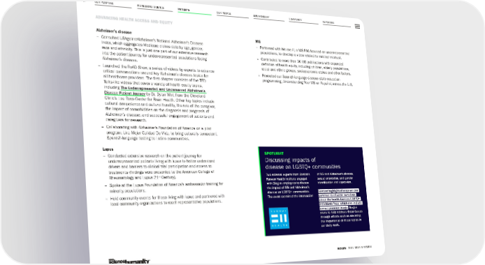 OUR PURPOSE PIONEERING SCIENCE PATIENTS OUR PEOPLE ENVIRONMENT COMMUNITY REPORTING 47 ADVANCING HEALTH ACCESS AND EQUITY BIOGEN 2021 YEAR IN REVIEW Alzheimer’s disease – Consulted USAgainstAlzheimer’s National Alzheimer’s Disease Index, which aggregates Medicare claims data by age, gender, race and ethnicity. This is just one part of our extensive research into the patient journey for underrepresented populations facing Alzheimer’s disease. – Launched the RoAD Show, a series of videos by experts to advance critical conversations around key Alzheimer’s disease topics for all healthcare providers. The first chapter consists of five TED Talks-like videos that cover a variety of health equity topics, including The Underrepresented and Underserved Alzheimer’s Disease Patient Journey by Dr. Dylan Wint from the Cleveland Clinic’s Lou Ruvo Center for Brain Health. Other key topics include cultural competence and cultural humility, the role of the caregiver, the impact of comorbidities on the diagnosis and prognosis of Alzheimer’s disease, and successful engagement of patients and caregivers for research. – Collaborating with Alzheimer’s Foundation of America on a pilot program, Una Mejor Calidad De Vida, to bring culturally competent, Spanish-language testing to Latino communities. Lupus – Conducted extensive research on the patient journey for underrepresented patients living with lupus to better understand drivers and barriers to clinical trial participation and access to treatments (findings were presented to the American College of Rheumatology and Lupus 21 st Century). – Spoke at the Lupus Foundation of America’s ambassador training for minority populations. – Held community events for those living with lupus and partnered with local community organizations to reach representative populations. MS – Partnered with We are Ill, a MS PAG focused on underrepresented populations, to develop a video related to medical mistrust. – Contributed to more than 30 MS publications with expanded definition of health equity, including children, elderly populations, racial and ethnic groups, socioeconomic status and other factors. – Promoted our Spanish-language disease state education programming, Understanding Your MS en Español, across the U.S. SPOTLIGHT Discussing impacts of disease on LGBTQ+ communities Two external experts from Boston’s Fenway Health Institute engaged with Biogen employees to discuss the impact of MS and Alzheimer’s disease on LGBTQ+ communities. The event examined the intersection of MS and Alzheimer’s disease, sexual orientation, and gender identification and expression. Content highlighted ways we can continue to educate ourselves about the health barriers LGBTQ+ individuals face, which can include correct pronoun usage. Biogen plans to help address these issues through efforts such as elevating the importance of these topics in our daily work.