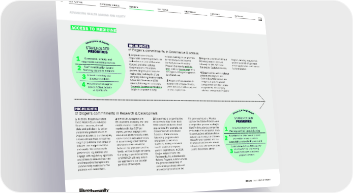 OUR PURPOSE PIONEERING SCIENCE PATIENTS OUR PEOPLE ENVIRONMENT COMMUNITY REPORTING 41 ADVANCING HEALTH ACCESS AND EQUITY BIOGEN 2021 YEAR IN REVIEW HIGHLIGHTS of Biogen’s commitments in Governance & Access 1 Biogen is committed to responsible business practices, as outlined in our Code of Business Conduct and other policies. Biogen’s Board of Directors governs Biogen’s processes for maintaining the integrity of the company, including Environmental, Social and Governance (ESG) issues, following the company’s Corporate Governance Principles . Biogen’s corporate strategy includes building on our priorities for health equity and access. Our Early Access Principles + Program Overview is available here . Visit our Access page for a description of Biogen’s approach to off-label use. 2 Biogen staff are incented to advance the company strategy, which includes health equity and access as priorities. 3 Biogen is committed to Ethical Marketing and to disclosure following the GRI, SASB and Stakeholder Capitalism metrics. 4 Biogen’s ethics and compliance policies and programs and Code of Business Conduct are designed, in part, to prevent corrupt or non-compliant activity in operations. The company also has a Responsible Supplier Program, including an evaluation process to identify any potential at-risk suppliers that could warrant further evaluation. ACCESS TO MEDICINE R e s e a r c h & D e v e l o p m e n t STAKEHOLDER PRIORITIES Product Development, Access Planning and R&D Capacity Building Underlines any clear benefit to lower- and middle-income countries: accessibility and availability are crucial Contributions to local R&D capacity are important re: empowering local researchers to address population needs 1 2 3 HIGHLIGHTS of Biogen’s commitments in Research & Development 1 In 2020, Biogen launched three Health Equity Advisory Boards – access, clinical trials and policies – to better understand patient needs to improve access to our therapies; ensure clinical trials reflect the target population; and consider policies that support access and equity. We comply with government regulations and engage with regulatory agencies and others to ensure that new and innovative therapies are commercially available to the patients who need them. 2 SPINRAZA is approved in 65 countries, including low- and middle-income countries. In markets with low GDP per capita, we have engaged with innovative agreements to meet each market’s individual needs. It is our strong belief that the decision to treat should be between the physician and the family, without budget concerns. Our policy to promote access to SPINRAZA will help inform our approach to our broader portfolio of therapies. 3 Biogen has a range of active initiatives to help foster local R&D capacity in diverse local populations. For example, we collaborate with Morehouse School of Medicine on a fellowship program which engages M.D. and Ph.D. students, aiming to advance health equity and improve patient experiences. In 2016, Biogen helped create The Partnership, Inc.’s BioDiversity Fellows Program, which nurtures the potential leadership of mid-career professionals who are underrepresented in the life sciences industry. We also sponsor the Golden Ticket Award, a competitive process seeking to identify rising startup companies in the field of neuroscience. Each Biogen-LabCentral Golden Ticket includes up to one year of bench space for one scientist and the benefits of LabCentral’s shared infrastructure and services at no cost to the contest winner. G o v e r n a n c e o f A c c e s s STAKEHOLDER PRIORITIES Governance, strategy and responsible business practices Staff incentivization toward fostering access to medicine Ethical marketing and disclosure policies Prevention of corrupt or non-compliant activity in operations 1 2 3 4