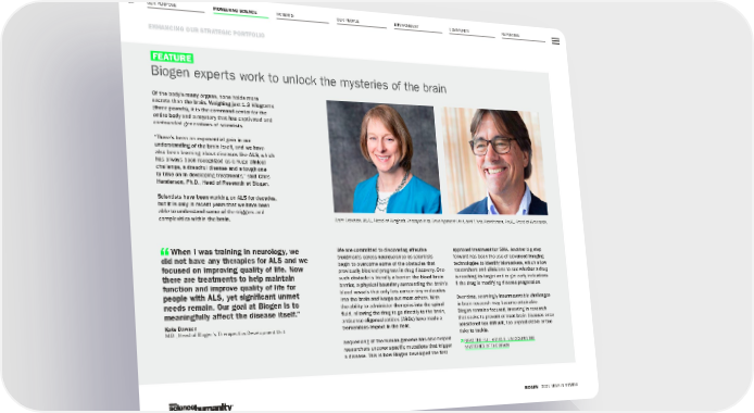 OUR PURPOSE PIONEERING SCIENCE PATIENTS OUR PEOPLE ENVIRONMENT COMMUNITY REPORTING 29 ENHANCING OUR STRATEGIC PORTFOLIO BIOGEN 2021 YEAR IN REVIEW FEATURE Biogen experts work to unlock the mysteries of the brain Of the body’s many organs, none holds more secrets than the brain. Weighing just 1.3 kilograms (three pounds), it is the command center for the entire body and a mystery that has captivated and confounded generations of scientists. “There’s been an exponential gain in our understanding of the brain itself, and we have also been learning about diseases like ALS, which has always been recognized as a huge clinical challenge, a dreadful disease and a tough one to take on in developing treatments,” said Chris Henderson, Ph.D., Head of Research at Biogen. Scientists have been working on ALS for decades, but it is only in recent years that we have been able to understand some of the triggers and complexities within the brain. We are committed to discovering effective treatments across neuroscience as scientists begin to overcome some of the obstacles that previously blocked progress in drug discovery. One such obstacle is literally a barrier: the blood-brain barrier, a physical boundary surrounding the brain’s blood vessels that only lets certain tiny molecules into the brain and keeps out most others. With the ability to administer therapies into the spinal fluid, allowing the drug to go directly to the brain, antisense oligonucleotides (ASOs) have made a tremendous impact in the field. Sequencing of the human genome has also helped researchers uncover specific mutations that trigger a disease. This is how Biogen developed the first approved treatment for SMA. Another big step forward has been the use of advanced imaging technologies to identify biomarkers, which allow researchers and clinicians to see whether a drug is reaching its target and to get early indications if the drug is modifying disease progression. Over time, seemingly insurmountable challenges in brain research may become attainable. Biogen remains focused, investing in research that seeks to prevent or treat brain diseases once considered too difficult, too unpredictable or too risky to tackle. Þ READ THE FULL ARTICLE, UNLOCKING THE MYSTERIES OF THE BRAIN Kate Dawson, M.D., Head of Biogen’s Therapeutics Development Unit, and Chris Henderson, Ph.D., Head of Research. When I was training in neurology, we did not have any therapies for ALS and we focused on improving quality of life. Now there are treatments to help maintain function and improve quality of life for people with ALS, yet significant unmet needs remain. Our goal at Biogen is to meaningfully affect the disease itself.” Kate Dawson M.D., Head of Biogen’s Therapeutics Development Unit