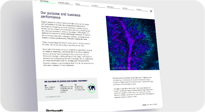 OUR PURPOSE PIONEERING SCIENCE PATIENTS OUR PEOPLE ENVIRONMENT COMMUNITY REPORTING 11 BIOGEN 2021 YEAR IN REVIEW Our purpose and business performance Biogen’s purpose is to serve humanity through science so that people can live healthier, fuller lives. Our cutting-edge approach aims to fundamentally change how we attack neurological disease since we believe that true leadership in neuroscience requires a pioneering spirit and a fearless commitment. Since our founding in 1978, Biogen has embraced this mindset to deliver breakthrough innovations in some of the world’s most intractable neurological diseases, including multiple sclerosis, spinal muscular atrophy, Alzheimer’s disease and more. Today, our growing global footprint serves millions of people around the world, and we are innovating to transform patient care. As we look to the future, we see an opportunity to go beyond treating a disease to preventing it. We believe that to do this successfully we must wield our deep knowledge of disease mechanisms and therapeutic strategies, while growing our multi-target, multi-modality approach and leveraging big data and technology. We are progressing a diverse neuroscience pipeline, leveraging the interconnectivity between diseases in our existing portfolio like with new areas such as Parkinson’s disease, ALS and depression. 40 direct Affiliates and growing +40 additional countries addressed through distribution partners 17 geographies added in the last three years WE CONTINUE TO EXPAND OUR GLOBAL FOOTPRINT 1 Multiple sclerosis myelinated axons. 1. As of December 31, 2021. Our people are the backbone of our organization. Together, we’re collaborating at the frontiers of science, healthcare and digital medicine to forge a future that redefines what’s possible for Biogen and the millions of patients we serve. At Biogen, we go where others won’t. True to our purpose and mission, we are continuing to advance breakthrough science that addresses significant unmet needs. As we advance our multi- franchise portfolio, we are excited by the possibility of bringing new treatment options to people in need.