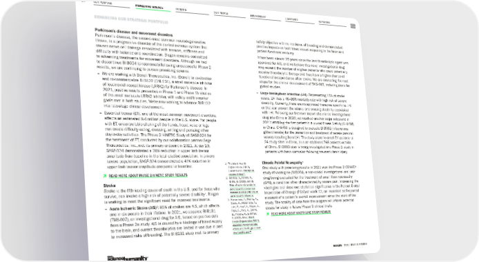 OUR PURPOSE PIONEERING SCIENCE PATIENTS OUR PEOPLE ENVIRONMENT COMMUNITY REPORTING 24 ENHANCING OUR STRATEGIC PORTFOLIO BIOGEN 2021 YEAR IN REVIEW Parkinson’s disease and movement disorders Parkinson’s disease, the second-most common neurodegenerative illness, is a progressive disorder of the central nervous system that causes nerve cell damage associated with tremors, stiffness and difficulty with balance and coordination. Biogen remains committed to advancing treatments for movement disorders. Although we had to discontinue BIIB054 (cinpanemab) following unsuccessful Phase 2 results, we are continuing to pursue promising science. – We are working with Denali Therapeutics, Inc. (Denali) to co-develop and co-commercialize BIIB122 (DNL151), a small molecule inhibitor of leucine-rich repeat kinase (LRRK2) for Parkinson’s disease. In 2021, positive results presented in Phase 1 and Phase 1b studies of the small molecule LRRK2 inhibitor, with safety and biomarker goals met in both studies. We’re now working to advance BIIB122 into late-stage clinical development. – Essential tremor (ET), one of the most common movement disorders, affects an estimated 6.4 million people in the U.S. alone. For people with ET, uncontrollable shaking of the hands, head, voice or legs can create difficulty eating, dressing, writing and pursuing other day-to-day activities. The Phase 2 KINETIC Study of SAGE-324 for the treatment of ET, conducted by our collaboration partner Sage Therapeutics, Inc., met its primary endpoint in 2021. At day 29, SAGE-324 demonstrated a 36% reduction in upper limb tremor amplitude from baseline in the total studied population. In a more severe population, SAGE-324 demonstrated a 41% reduction in upper limb tremor amplitude compared to baseline. Þ READ MORE ABOUT PHASE 2 KINETIC STUDY RESULTS Stroke Stroke is the fifth-leading cause of death in the U.S. and for those who survive, can involve a high risk of potentially severe disability 1 . Biogen is working to meet the significant need for improved treatments. – Acute Ischemic Stroke (AIS) 2 : 85% of strokes are AIS, which affects one in six people in their lifetime. In 2021, we acquired BIIB131 (TMS-007), an investigational drug for AIS, based on positive data from a Phase 2a study. AIS is caused by a blockage of blood supply to the brain, and current thrombolytics are limited in use due in part to increased risks of bleeding. The BIIB131 study met its primary safety objective with no incidence of bleeding and demonstrated positive impacts on both blood vessel reopening in the brain and patient functional recovery. It has been almost 25 years since the last thrombolytic agent was approved for AIS, and we believe this novel investigational drug may expand the number of eligible patients who could potentially receive thrombolytic therapy and thus have a higher chance of functional independence after stroke. We are evaluating the next steps for the clinical development of TMS-007, including plans for global studies. – Large hemispheric infarction (LHI): Representing 15% of stroke cases, LHI has a 40–80% mortality rate with high risk of severe disability. Currently, there are no approved therapies specific to LHI or that can prevent the edema and ensuing disability associated with LHI. Following our first-ever import of a clinical investigational drug into China in 2020, we reached another major milestone in 2021: enrolling the first patient in a pivotal Phase 3 study (CHARM) in China. CHARM is designed to evaluate BIIB093 (intravenous glibenclamide) for the prevention and treatment of severe cerebral edema resulting from LHI. The study plans to enroll 54 patients at 24 study sites in China, plus an additional 768 patients outside of China. BIIB093 also is being investigated in a Phase 2 study in patients with brain contusion following traumatic brain injury. Chronic Painful Neuropathy 3 One study with promising results in 2021 was the Phase 2 CONVEY study of vixotrigine (BIIB074), a non-opioid investigational oral pain drug being evaluated for the treatment of small fiber neuropathy (SFN), a condition often characterized by severe pain. Increasing the vixotrigine trial dose met statistical significance in the Patient Global Impression of Change (PGIC) at week 12, an important self-reported measure of a patient’s overall improvement since the start of the study. The totality of data from the program will inform potential doses for study in future Phase 3 clinical trials. Þ READ MORE ABOUT VIXOTRIGINE STUDY RESULTS 1. The World Health Organization. (2020, December 9). The top 10 causes of death . 2. Merkler, A., Parikh, N., & Mir, S. (2020, July 2). Risk of ischemic stroke in patients with coronavirus disease 2019 (COVID-19) vs patients with influenza . 3. Kamerman, P., Wadley, A., Davis, K., Hietaharju, A., Jain, P., Kopf, A., Meyer, A., Raja, S., Rice, A., Smith, B., Treede, R., & Wiffen, P. (2015, May). World Health Organization (WHO) essential medicines lists: where are the drugs to treat neuropathic pain?