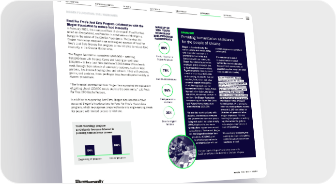 OUR PURPOSE PIONEERING SCIENCE REPORTING 113 BIOGEN FOUNDATION: 2021 HIGHLIGHTS BIOGEN 2021 YEAR IN REVIEW PATIENTS OUR PEOPLE ENVIRONMENT COMMUNITY Youth Neurology program participants increase interest in pursuing neuroscience careers Food For Free’s Just Eats Program collaborates with the Biogen Foundation to reduce food insecurity In February 2021, the sources of food that nonprofit Food For Free relied on disappeared, and families in need were at risk of going hungry in the midst of the COVID-19 pandemic. That’s when the Biogen Foundation stepped in as an inaugural sponsor of Food For Free’s Just Eats Grocery Box program, a new initiative to reduce food insecurity in the Greater Boston area. The Biogen Foundation committed $100,000 – matching $50,000 from Life Science Cares and funding an additional $50,000 – to help Just Eats distribute 3,000 boxes of food each week through their network of community partners, such as food pantries, low-income housing sites and schools. Filled with produce, grains, and proteins, these packages have been dispersed widely to diverse populations. “The financial contribution from Biogen has supported the equivalent of getting about 120,000 meals out into the community,” said Food For Free CEO Sasha Purpura. In addition to supporting Just Eats, Biogen also donates kitchen space at Biogen’s headquarters for Food For Free’s Heat-n-Eats program, which re-purposes prepared foods into single-serving meals for people with limited access to kitchens. SPOTLIGHT Providing humanitarian assistance for the people of Ukraine Biogen is heartbroken by the war in Ukraine and stands firmly with the global community in providing humanitarian aid. Consistent with our values, the Biogen Foundation launched an employee giving campaign that is doubling employee donations. Together we have already raised a total of more than $550,000 and counting, to provide medical supplies, food, water and other essential support through five charitable organizations: the International Medical Corps, Polish Humanitarian Action, the Swiss Red Cross, UNICEF and UNHCR. In addition, the Biogen Foundation is supporting the Swiss Red Cross and Poland Humanitarian with grants totaling $250,000. We are also working closely with patients, the medical community and governments to ensure people living with spinal muscular atrophy (SMA) displaced by the war in Ukraine have access to treatment across Europe. To that end, Biogen and the Biogen Foundation have provided a €25,000 grant to SMA Europe and are in communication with our partners to guarantee continued patient care. This assistance is part of an overall commitment of $1.9 million that also includes Biogen in-kind contributions of essential supplies, employee relief bonuses and volunteering. “We are inspired by Biogen employees worldwide who are stepping up to meet the moment, and we are particularly humbled by our colleagues in Poland, who are opening their hearts and homes to Ukrainian refugees and finding many other ways to serve” , says Biogen Poland employee Adrian Laorden, who, among his other volunteering efforts, recently prepared 1,100 sandwiches for Ukrainian refugees with fellow Biogen employees. “It’s very touching that people are working together across the globe to help refugees from Ukraine in need of assistance.” We are closely monitoring this evolving situation and exploring additional ways to support our neighbors in need. Patrycja Cogiel of Biogen Poland labels some of the 1,100 sandwiches to be delivered to Ukrainian refugees. 54% Beginning of program End of program 100% MAKEUP OF MGH YOUTH NEUROLOGY 2021 PROGRAM PARTICIPANTS 86% Black, Hispanic or Native American 76% Female or non-binary 86% First-generation students 31% From immigrant families