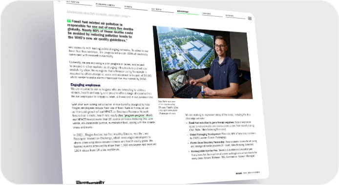OUR PURPOSE PIONEERING SCIENCE COMMUNITY REPORTING 82 ADVANCING HEALTHY CLIMATE, HEALTHY LIVES™ BIOGEN 2021 YEAR IN REVIEW PATIENTS OUR PEOPLE ENVIRONMENT and accounts with leading public charging networks. To advance our fossil fuel free ambition, the program will match 100% of electricity consumed with renewable electricity. Currently, we are exploring a pilot program in Japan, and expect to expand in other markets as charging infrastructure and vehicle availability allow. We recognize that a broader policy framework is required to affect change at scale and are proud to be part of EV100, which seeks to make electric transport the new normal by 2030. Engaging employees We are inspired by our colleagues who are innovating to address climate, health and equity, and proud to offer a range of opportunities for our employees to engage at work, at home and in our communities. Last year saw strong participation in new benefits designed to help Biogen employees reduce their use of fossil fuels at home, as well as the rapid growth of ourIMPACT, an Employee Resource Network focused on climate, health and equity ( See “program progress” chart ). ourIMPACT hosted more than 20 events on topics including EVs, zero waste, environmental justice, sustainable food, coping with the climate crisis and more. In 2021, Biogen hosted our first Healthy Climate, Healthy Lives Employee Innovation Challenge, which encouraged employees to share promising ideas around climate and health equity goals. We hosted events attended by more than 1,000 employees and received 180+ ideas from 14 sites worldwide. We are working to implement many of the ideas, including the four challenge winners: – Fossil fuel reduction by gene therapy suppliers: Expand expiration dates to reduce waste and decrease emissions from manufacturing (Dan Blake, Manufacturing Sciences). – Global Packaging Development: Eliminate 80% of insulated solutions by 2025 (Laurent Dionet, Packaging). – Plastic Drum Recycling Partnership: Recycle plastic drums for shipping and storage of media powders (Bill Scott, Manufacturing Sciences). – Rechargeable Injector Pen: Develop a durable and reusable pen that allows for the insertion of a new cartridge and a new needle for every dose (Anders Niklason, BBU Commercial Account Manager). Fossil fuel related air pollution is responsible for one out of every five deaths globally. Nearly 80% of these deaths could be avoided by reducing pollution levels to the WHO’s new air quality guidelines.” Dan Blake was one of the first Healthy Climate, Healthy Lives Employee Innovation Challenge winners.