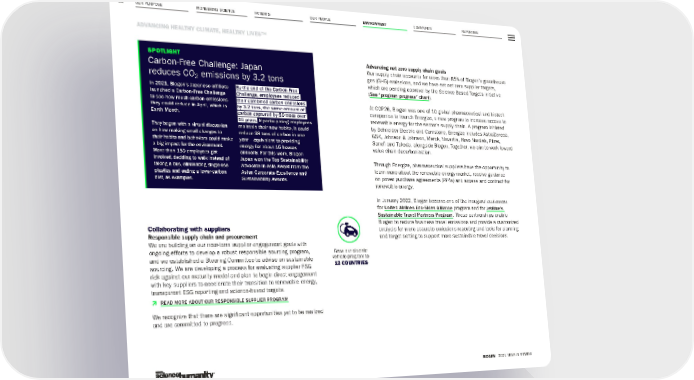 OUR PURPOSE PIONEERING SCIENCE COMMUNITY REPORTING 83 ADVANCING HEALTHY CLIMATE, HEALTHY LIVES™ BIOGEN 2021 YEAR IN REVIEW PATIENTS OUR PEOPLE ENVIRONMENT Collaborating with suppliers Responsible supply chain and procurement We are building on our near-term supplier engagement goals with ongoing efforts to develop a robust responsible sourcing program, and we established a Steering Committee to advise on sustainable sourcing. We are developing a process for evaluating supplier ESG risk against our maturity model and plan to begin direct engagement with key suppliers to accelerate their transition to renewable energy, transparent ESG reporting and science-based targets. Þ READ MORE ABOUT OUR RESPONSIBLE SUPPLIER PROGRAM We recognize that there are significant opportunities yet to be realized and are committed to progress. Advancing net zero supply chain goals Our supply chain accounts for more than 85% of Biogen’s greenhouse gas (GHG) emissions, and we have set net zero supplier targets, which are pending approval by the Science Based Targets initiative ( See “program progress” chart ). At COP26, Biogen was one of 10 global pharmaceutical and biotech companies to launch Energize, a new program to increase access to renewable energy for the sector’s supply chain. A program initiated by Schneider Electric and Carnstone, Energize includes AstraZeneca, GSK, Johnson & Johnson, Merck, Novartis, Novo Nordisk, Pfizer, Sanofi and Takeda, alongside Biogen. Together, we aim to work toward value chain decarbonization. Through Energize, pharmaceutical suppliers have the opportunity to learn more about the renewable energy market, receive guidance on power purchase agreements (PPAs) and access and contract for renewable energy. In January 2022, Biogen became one of the inaugural customers for United Airlines Eco-Skies Alliance program and for JetBlue’s Sustainable Travel Partners Program . These partnerships enable Biogen to reduce business travel emissions and provide a customized analysis for more accurate emissions reporting and tools for planning and target setting to support more sustainable travel decisions. SPOTLIGHT Carbon-Free Challenge: Japan reduces CO 2 emissions by 3.2 tons In 2021, Biogen’s Japanese affiliate launched a Carbon-Free Challenge to see how much carbon emissions they could reduce in April, which is Earth Month. They began with a virtual discussion on how making small changes to their habits and behaviors could make a big impact for the environment. More than 150 employees got involved, deciding to walk instead of taking a bus, eliminating single-use plastics and eating a lower-carbon diet, as examples. By the end of the Carbon-Free Challenge, employees reduced their combined carbon emissions by 3.2 tons, the same amount of carbon captured by 50 trees over 10 years. If participating employees maintain their new habits, it could reduce 38 tons of carbon in one year – equivalent to providing energy for about 15 houses annually. For this work, Biogen Japan won the Top Sustainability Advocate in Asia Award from the Asian Corporate Excellence and Sustainability Awards. Grew our electric vehicle program to 12 COUNTRIES
