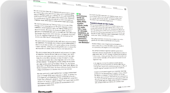 OUR PURPOSE PIONEERING SCIENCE PATIENTS OUR PEOPLE ENVIRONMENT COMMUNITY REPORTING 9 CEO LETTER BIOGEN 2021 YEAR IN REVIEW And we did not stop there. We collaborated with global scientific leaders on a meta-analysis of air pollution and dementia and a groundbreaking survey of 450-plus health clinic staff from 47 U.S. states to garner real- world insights into the health impacts of the climate crisis. Additionally, we accelerated our ongoing work with MIT to create a state-of-the-art integrated model of how various climate actions impact public health. We also have advanced our Diversity, Equity and Inclusion (DE&I) strategy, with an ongoing focus on hiring and engaging a diverse workforce, promoting health equity, and making notable gains in supplier diversity. We shared the results of a global pay equity analysis with employees and publicly disclosed our EEO-1 data (Equal Employment Opportunity), which provides a demographic breakdown of our U.S. workforce by gender and race, and released our first stand-alone DE&I Report in October 2021. We strive to build on our priorities for health equity and access across our operations. For example, we continue to expand efforts globally in order to reach more patients, with a growing focus on low- and middle- income countries. Globally, we are taking further action to ensure that our research and clinical trials are inclusive and representative. We aim to remove barriers for treatment and overcome the stigma of dementia. Black or African American and Hispanic and Latino populations are respectively two and one-and-a-half times more likely than older White Americans to have Alzheimer’s disease, yet they are also more likely to be diagnosed later in the course of their disease 4 . To change this, we are working with advocates and organizations such as The Balm in Gilead, Inc., the National Association of Free and Charitable Clinics, Black Health Matters, the Global Alzheimer’s Platform, the National Minority Quality Forum and USAgainstAlzheimer’s to improve early detection and care. We also continue to invest significantly in building a diverse talent pipeline through STEM equity education. In 2021, we entered into a collaboration with Morehouse School of Medicine to launch a Health Equity Fellowship program, through which M.D. and/or Ph.D. students will advance projects at Biogen that support more equitable healthcare experiences for patients in underrepresented and underserved communities. As a result of our ESG commitments and progress, we were listed as the top biotech leader on the Dow Jones Sustainability World Index for a seventh time and won the 2021 U.S. Chamber of Commerce Foundation’s best sustainability program award. Potential for Growth and Value Creation We have entered 2022 with a robust and diversified pipeline, which includes approximately 30 clinical programs across a broad set of disease areas and multiple modalities, 10 of which are in Phase 3 or filed. We attribute this success to our own innovative research and to the more than 30 business development deals we have reached over the past five years, spanning a range of disease areas including MS, depression, stroke, and Parkinson’s disease. Our work going forward is based on four strategic pillars to drive growth and value creation over the medium to long term. The first of these pillars is Biogen’s continued leadership in neuroscience, which as of April 29, 2022, comprises over 20 of our approximately 30 programs in clinical development. We continue to believe in significant potential opportunities in Alzheimer’s disease and depression, two large therapeutic areas with great unmet need. For 2022, we expect two remaining data readouts in these areas, including additional Phase 3 data for zuranolone and pivotal data for lecanamab, with the potential to complete two new regulatory filings. In the long term, we have the opportunity to build upon our planned entry into neuropsychiatry with BIIB104 (AMPA PAM), an investigational drug which is currently being evaluated in a Phase 2 study for cognitive impairment associated with schizophrenia. A second pillar of potential growth is our specialized immunology portfolio with two promising Phase 3 programs in lupus, a disease that affects an estimated 1.5 million Americans and at least five million people worldwide 5 . We believe we have potential first-in- class molecules for both systemic lupus erythematosus (SLE), with dapirolizumab pegol (anti-CD40L) being developed in collaboration with UCB and BIIB059 (anti-BDCA2), and cutaneous lupus Our Environmental, Social and Governance (ESG) efforts prioritize climate, health and equity, with a focus on vulnerable populations, as well as ongoing leadership in governance, transparency and disclosure.”