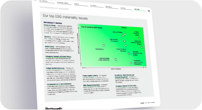 OUR PURPOSE PIONEERING SCIENCE 117 2021 ESG MATERIALITY ASSESSMENT BIOGEN 2021 YEAR IN REVIEW PATIENTS OUR PEOPLE ENVIRONMENT COMMUNITY REPORTING MATERIALITY MATRIX Access & Pricing Expanding the availability of affordable medicines for patients, including the world’s poor, by improving the obtainability of medicines and developing appropriate pricing models. This encompasses working with PAGs. Bioethics Addressing ethical issues emerging from advances in biology, medicine and technology, linked to public health, public policy, law, environment and well-being. Health Equity Allowing people to attain their full health potential so that no one is marginalized based on their social position or other circumstances. Information Security & Patient Privacy Adopting and implementing policies and practices that safeguard the privacy of patient information and protect data from unintended intruders. Patient Health & Outcomes Ensuring that patients are properly and effectively informed regarding medicine usage and the continuous improvement in health outcomes occurring as a result of usage. Outcomes may be measured clinically (e.g., physical examination, laboratory testing and imaging), self-reported or observed. Pharmaceuticals in the Environment Addressing types of environmental pollution from discarded pharmaceuticals, including in rivers, lakes and other bodies of water, and assessing and mitigating possible impacts and health risks. Our top ESG materiality issues Bioethics IMPORTANCE TO STAKEHOLDERS IMPACT TO BIOGEN MEDIUM HIGH Product Quality & Safety Information Security & Patient Privacy Workplace Employee Health & Safety Patient Health & Outcomes Recruitment, Talent Retention & Engagement Access & Pricing R&D, Pipeline & Innovation Pharmaceuticals in the Environment Health Equity Product Quality & Safety Pursuing high standards in product quality and safety, including management systems and auditing, that meet or exceed regulatory requirements. R&D, Pipeline & Innovation Developing innovative products that treat systemic, challenging and complex medical issues and address the unmet medical needs of patients around the globe. Recruitment, Talent Retention and Employee Engagement Attracting and retaining top talent while also finding ways to keep employees motivated and committed to the company. Workplace Employee Health & Safety Undertaking efforts to assess and mitigate potential risks that could impact the health, safety or welfare of workers and implementing activities or programs to provide employees with a safe and healthy workplace. MEDIUM HIGH Top 10 material ESG issues