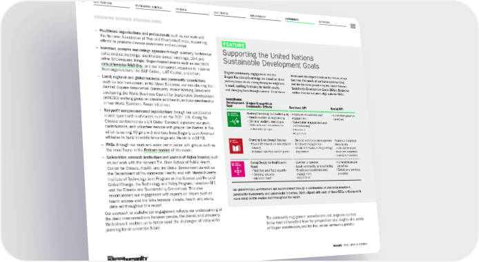 OUR PURPOSE PIONEERING SCIENCE REPORTING 97 ENGAGING DIVERSE STAKEHOLDERS BIOGEN 2021 YEAR IN REVIEW PATIENTS OUR PEOPLE ENVIRONMENT COMMUNITY FEATURE Supporting the United Nations Sustainable Development Goals Biogen’s community engagement and the Biogen Foundation’s strategy are based on three primary focus areas: caring deeply for neighbors in need, working fearlessly for health equity, and changing lives through science. These focus areas were developed based on the nature of our business, the needs of our home communities, and the blueprint provided by the United Nations Sustainable Development Goals (SDGs). Below, we outline how our activities align with the SDGs. Our philanthropic contributions are accomplished through a combination of charitable donations, community investments and commercial initiatives. Work aligned with each of these SDGs is discussed in more detail in this section and throughout the report. – Healthcare organizations and professionals such as our work with the National Association of Free and Charitable Clinics, supporting efforts to promote disease awareness and education. – Investors, analysts and ratings agencies through quarterly conference calls; analyst meetings; stockholder annual meetings; 10-K and other SEC-required filings; Biogen-hosted events such as our 2021 virtual Investor R&D Day ; and our transparent response to inquiries from organizations like S&P Global, JUST Capital, and others. – Local, regional and global business and community associations such as our involvement in We Mean Business, our role chairing the Kendall Square Association Community Impact Working Group and co-chairing the World Business Council for Sustainable Development (WBCSD) working group on climate and health, and our membership in two World Economic Forum initiatives. – Nonprofit nongovernmental organizations through our participation in and sponsorship of events such as the 2021 U.N. Caring for Climate conference as a UN Global Compact signatory; our grant contributions; and volunteer service with groups like Women In Bio, which is pairing 40 girls with mentors from Biogen’s Latin American affiliates to build scientific knowledge and life skills in STEM. – PAGs through our work and event participation with groups such as the ones found in the Patients section of this report. – Universities, research institutions and centers of higher learning such as our work with the Harvard T.H. Chan School of Public Health, Center for Climate, Health, and the Global Environment as well as the Department of Environmental Health; and with Massachusetts Institute of Technology Joint Program on the Science and Policy of Global Change, the Technology and Policy Program, Lemelson-MIT, and the Climate and Sustainability Consortium. This also encompasses our engagement with experts on issues such as health access and the links between climate, health and equity, detailed throughout this report. Our approach to stakeholder engagement reflects our understanding of the deep interconnections between people, the planet, and prosperity. We believe it enables us to better meet the challenges of today while planning for an uncertain future. Sustainable Development Goal Biogen Group-Wide Community Efforts Business KPI Social KPI Working Fearlessly for Health Equity • Health system strengthening • Climate resilient healthcare • Outreach and education for vulnerable groups • Employee recruitment and engagement • Stakeholder engagement and understanding • Innovation • Reputation • Vulnerable patients benefited Changing Lives through Science • Equitable education and teacher training • Inclusive science career paths • Diverse workforce development • Employee engagement • Local community strengthening • Reputation • Students benefited • Historically underrepresented students benefited • Teachers benefited Caring Deeply for Neighbors in Need • Nutrition and food security • Clothing security • Disaster relief • License to operate • Local community strengthening • Employee recruitment and engagement • Reputation • Vulnerable people benefited • Goods and services provided The community engagement commitments and programs outlined below have all benefited from the perspectives and insights of a variety of Biogen stakeholders, and for that, we are profoundly grateful.
