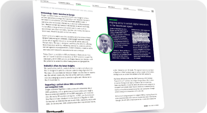 OUR PURPOSE PIONEERING SCIENCE PATIENTS OUR PEOPLE ENVIRONMENT COMMUNITY REPORTING 54 WORKING AT THE INTERSECTION OF TECHNOLOGY AND WELL-BEING BIOGEN 2021 YEAR IN REVIEW Immunology: Care+ launches in Europe Biogen launched Care+, a new mobile health app designed to help patients proactively manage their conditions and improve treatment outcomes in consultation with their healthcare professionals. It contains detailed disease information, a practical self-assessment tool, lifestyle content and product information (in select countries). It also offers a range of practical patient-centric tools such as appointment and dose reminders, injection site history, medication travel card, MedInfo support contact and more. Care+ is the only mobile app that supports patients across a broad range of immunological diseases, covering eight separate disease states which together impact an estimated 30 million people in Europe alone. The app is designed specifically for patients suffering from rheumatoid arthritis, ankylosing spondylitis, psoriatic arthritis, non-radiographic spondyloarthritis, Crohn’s disease, ulcerative colitis, psoriasis and hidradenitis suppurativa (or acne inversa). Today, Care+ is available in iOS and Android in Germany and Italy and will launch in additional countries in 2022 to better support the community of 244,000 patients on Biogen biosimilars therapy – with the potential to extend to other therapy areas and geographies. insideALS offers the latest insights We launched insideALS, a website for both patients and physicians that is designed to provide a deeper understanding of genetic ALS. The result of a collaboration between Biogen, outside medical experts and the patient community, the site will be continually updated with the emerging science to provide insights and information to the ALS community. Supporting a patient-driven SMA community and navigation tools Biogen sponsors Together in SMA, a site with information about SMA symptoms, clinical guidelines and care options and insights from experienced members of the SMA community, with localized sites for nearly 30 countries or regions. In 2021, our Australia and New Zealand team introduced a new element to Together in SMA: Be Inspired, an SMA hub for adults with SMA, created by adults with SMA. On Be Inspired, SMA patients share their inspirational stories, SPOTLIGHT Aligning policy to unlock digital innovation in the healthcare space As part of World MS Day 2021, Biogen’s Shibi Belachew, Head of Science, Biogen Digital Health, Analytics and Solutions, participated in a virtual policy discussion convened by The Economist, alongside Eva Kaili, member of the European Parliament and Chair of the Committee for the Future of Science and Technology. During the “Brain and Machine: Improving MS in a Digital Age” fireside chat, the discussion focused on how we can align policy to unlock digital innovation in the healthcare space. Shibi underscored the importance of data, noting that an increase in the availability of different data in the healthcare environment has the potential to create a more holistic body of knowledge for regulatory decision making. He also emphasized how critical it will be to harmonize rules for digital technologies and devices across EU countries to support competitiveness in digital innovation, and stressed that accelerating the pace of scientific innovation requires effective policies and sufficient investment for research. useful information and life hacks. The regional team also developed a Together in SMA Facebook page to connect people to Be Inspired, striving to deliver content that matters to the SMA community. Our Swiss affiliate launched the SMA Aurora app, which delivers “beyond-the-pill” services and bridges the gap from a first-in-class innovative therapy to an equally innovative patient experience. Some app benefits include the ability for patients and caregivers to document and assess motor function skills and increased service quality and qualitative remote motor function assessment through patient/caregiver collaboration with a provider. We’re also helping young adults navigate SMA by inspiring them to be more proactive about their care and aspirational about their futures, through Life with SMA virtual experiences – a simulation series we