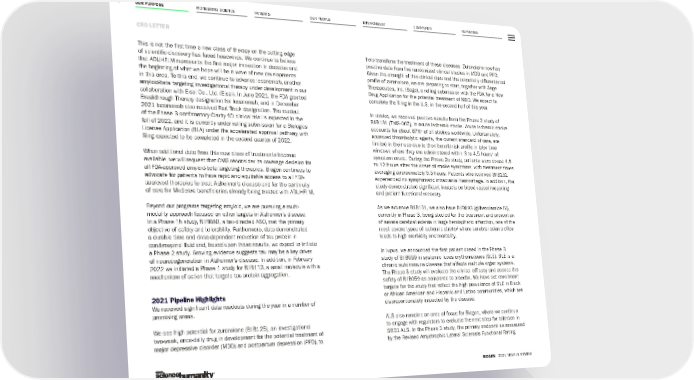OUR PURPOSE PIONEERING SCIENCE PATIENTS OUR PEOPLE ENVIRONMENT COMMUNITY REPORTING 7 CEO LETTER BIOGEN 2021 YEAR IN REVIEW This is not the first time a new class of therapy on the cutting edge of scientific discovery has faced headwinds. We continue to believe that ADUHELM represents the first major innovation in decades and the beginning of what we hope will be a wave of new developments in this area. To this end, we continue to advance lecanemab, another amyloid-beta targeting investigational therapy under development in our collaboration with Eisai Co., Ltd. (Eisai). In June 2021, the FDA granted Breakthrough Therapy designation for lecanemab, and in December 2021 lecanemab also received Fast Track designation. The readout of the Phase 3 confirmatory Clarity AD clinical trial is expected in the fall of 2022, and it is currently under rolling submission for a Biologics License Application (BLA) under the accelerated approval pathway, with filing expected to be completed in the second quarter of 2022. When additional data from this new class of treatments become available, we will request that CMS reconsider its coverage decision for all FDA-approved amyloid-beta targeting therapies. Biogen continues to advocate for patients to have rapid and equitable access to all FDA- approved therapies to treat Alzheimer’s disease and for the continuity of care for Medicare beneficiaries already being treated with ADUHELM. Beyond our programs targeting amyloid, we are pursuing a multi- modality approach focused on other targets in Alzheimer’s disease. In a Phase 1b study, BIIB080, a tau-directed ASO, met the primary objective of safety and tolerability. Furthermore, data demonstrated a durable time and dose-dependent reduction of tau protein in cerebrospinal fluid and, based upon these results, we expect to initiate a Phase 2 study. Growing evidence suggests tau may be a key driver of neurodegeneration in Alzheimer’s disease. In addition, in February 2022 we initiated a Phase 1 study for BIIB113, a small molecule with a mechanism of action that targets tau protein aggregation. 2021 Pipeline Highlights We received significant data readouts during the year in a number of promising areas. We see high potential for zuranolone (BIIB125), an investigational two-week, once-daily drug in development for the potential treatment of major depressive disorder (MDD) and postpartum depression (PPD), to help transform the treatment of these diseases. Zuranolone now has positive data from five randomized clinical studies in MDD and PPD. Given the strength of this clinical data and the potentially differentiated profile of zuranolone, we are preparing to start, together with Sage Therapeutics, Inc. (Sage), a rolling submission with the FDA for a New Drug Application for the potential treatment of MDD. We expect to complete the filing in the U.S. in the second half of this year. In stroke, we received positive results from the Phase 2 study of BIIB131 (TMS-007), in acute ischemic stroke. Acute ischemic stroke accounts for about 87% 1 of all strokes worldwide. Unfortunately, approved thrombolytic agents, the current standard of care, are limited in their use due to their benefit-risk profile in later time windows where they are administered within 3 to 4.5 hours 1 of symptom onset. During the Phase 2a study, patients were dosed 4.5 to 12 hours after the onset of stroke symptoms, with treatment times averaging approximately 9.5 hours. Patients who received BIIB131 experienced no symptomatic intracranial hemorrhage. In addition, the study demonstrated significant impacts on blood vessel reopening and patient functional recovery. As we advance BIIB131, we also have BIIB093 (glibenclamide IV), currently in Phase 3, being studied for the treatment and prevention of severe cerebral edema in large hemispheric infarction, one of the most severe types of ischemic stroke 2 where cerebral edema often leads to high morbidity and mortality. In lupus, we announced the first patient dosed in the Phase 3 study of BIIB059 in systemic lupus erythematosus (SLE). SLE is a chronic autoimmune disease that affects multiple organ systems. The Phase 3 study will evaluate the clinical efficacy and assess the safety of BIIB059 as compared to placebo. We have set enrollment targets for the study that reflect the high prevalence of SLE in Black or African American and Hispanic and Latino communities, which are disproportionately impacted by the disease. ALS also remains an area of focus for Biogen, where we continue to engage with regulators to evaluate the next step for tofersen in SOD1 ALS. In the Phase 3 study, the primary endpoint as measured by the Revised Amyotrophic Lateral Sclerosis Functional Rating