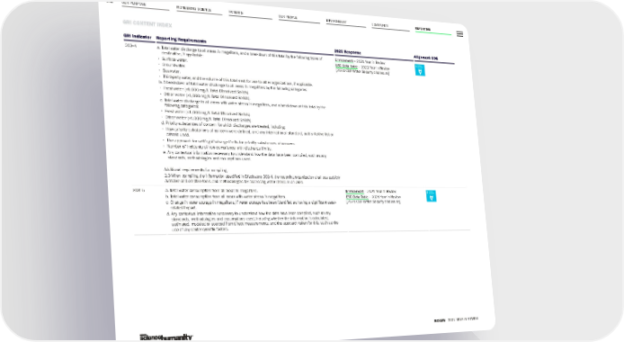 OUR PURPOSE PIONEERING SCIENCE 142 GRI CONTENT INDEX BIOGEN 2021 YEAR IN REVIEW PATIENTS OUR PEOPLE ENVIRONMENT COMMUNITY REPORTING GRI indicator Reporting Requirements 2021 Response Alignment SDG 303–4 a. Total water discharge to all areas in megaliters, and a breakdown of this total by the following types of destination, if applicable: • Surface water. • Groundwater. • Seawater. • Third-party water, and the volume of this total sent for use to other organizations, if applicable. b. A breakdown of total water discharge to all areas in megaliters by the following categories: • Freshwater (≤1,000 mg/L Total Dissolved Solids). • Other water (>1,000 mg/L Total Dissolved Solids). c. Total water discharge to all areas with water stress in megaliters, and a breakdown of this total by the following categories: • Freshwater (≤1,000 mg/L Total Dissolved Solids). • Other water (>1,000 mg/L Total Dissolved Solids). d. Priority substances of concern for which discharges are treated, including: • How priority substances of concern were defined, and any international standard, authoritative list or criteria used. • The approach for setting discharge limits for priority substances of concern. • Number of incidents of non-compliance with discharge limits. e. Any contextual information necessary to understand how the data have been compiled, such as any standards, methodologies and assumptions used. Additional requirements for compiling: 2.3 When compiling the information specified in Disclosure 303-4, the reporting organization shall use publicly available and credible tools and methodologies for assessing water stress in an area. Environment – 2021 Year in Review ESG Data Table – 2021 Year in Review [2021 CDP Water Security disclosure] 303–5 a. Total water consumption from all areas in megaliters. b. Total water consumption from all areas with water stress in megaliters. c. Change in water storage in megaliters, if water storage has been identified as having a significant water- related impact. d. Any contextual information necessary to understand how the data have been compiled, such as any standards, methodologies and assumptions used, including whether the information is calculated, estimated, modeled or sourced from direct measurements, and the approach taken for this, such as the use of any sector-specific factors. Environment – 2021 Year in Review ESG Data Table – 2021 Year in Review [2021 CDP Water Security disclosure]