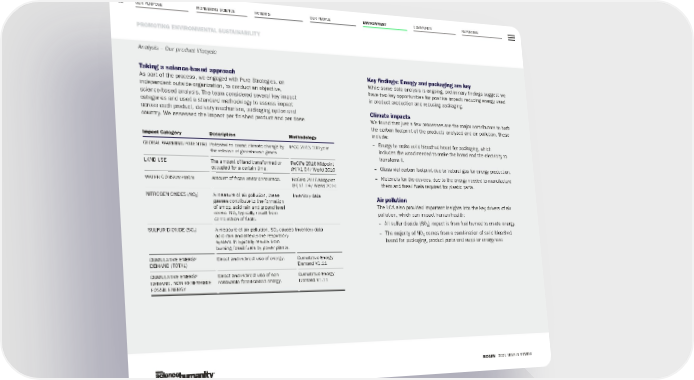 OUR PURPOSE PIONEERING SCIENCE COMMUNITY REPORTING 91 PROMOTING ENVIRONMENTAL SUSTAINABILITY BIOGEN 2021 YEAR IN REVIEW PATIENTS OUR PEOPLE ENVIRONMENT Analysis – Our product lifecycle Taking a science-based approach As part of the process, we engaged with Pure Strategies, an independent outside organization, to conduct an objective, science-based analysis. The team considered several key impact categories and used a standard methodology to assess impact across each product, delivery mechanism, packaging option and country. We assessed the impact per finished product and per dose. Key findings: Energy and packaging are key While some data analysis is ongoing, preliminary findings suggest we have two key opportunities for positive impact: reducing energy used in product production and reducing packaging. Climate impacts We found that just a few processes are the major contributors to both the carbon footprint of the products analyzed and air pollution. These include: – Energy to make solid bleached board for packaging, which includes the wood needed to make the board and the electricity to transform it. – Glass vial carbon footprint due to natural gas for energy production. – Materials for the devices, due to the energy needed to manufacture them and fossil fuels required for plastic parts. Air pollution The LCA also provided important insights into the key drivers of air pollution, which can impact human health: – All sulfur dioxide (SO 2 ) impact is from fuel burned to create energy. – The majority of NO X comes from a combination of solid bleached board for packaging, product parts and supplier energy use. Impact Category Description Methodology GLOBAL WARMING POTENTIAL Potential to cause climate change by the release of greenhouse gases. IPCC 2013 100-year LAND USE The amount of land transformed or occupied for a certain time. ReCiPe 2016 Midpoint (H) V1.04/ World 2010 WATER CONSUMPTION Amount of fresh water consumed. ReCiPe 2016 Midpoint (H) V1.04/ World 2010 NITROGEN OXIDES (NO X ) A measure of air pollution, these gasses contribute to the formation of smog, acid rain and ground level ozone. NO X typically result from combustion of fuels. Inventory data SULFUR DIOXIDE (SO 2 ) A measure of air pollution, SO 2 causes acid rain and affects the respiratory system. It typically results from burning fossil fuels by power plants. Inventory data CUMULATIVE ENERGY DEMAND (TOTAL) Direct and indirect use of energy. Cumulative Energy Demand V1.11 CUMULATIVE ENERGY DEMAND, NON-RENEWABLE FOSSIL ENERGY Direct and indirect use of non- renewable fossil-based energy. Cumulative Energy Demand V1.11