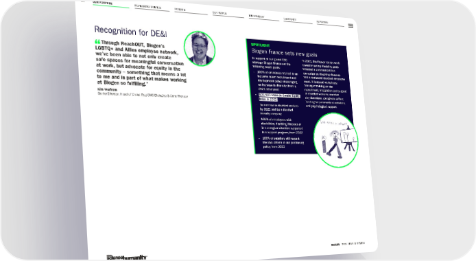 OUR PURPOSE PIONEERING SCIENCE PATIENTS OUR PEOPLE ENVIRONMENT COMMUNITY REPORTING 14 BIOGEN 2021 YEAR IN REVIEW SPOTLIGHT Biogen France sets new goals In support of our global ESG strategy, Biogen France set the following social goals: – 100% of employees trained in an inclusive talent recruitment and development policy encouraging an increase in diversity (from a 2021 base year) – 100/100 score on Gender Equity Index in 2022 – 3x increase in disabled workers by 2022 and be a disabled- friendly company – 100% of employees with disabilities, disabling illnesses or in a caregiver situation supported in a support program, from 2022 – 100% of suppliers will respect the ESG criteria in our purchasing policy, from 2022 In 2021, the France team’s work toward meeting disability goals included a communications campaign on disabling diseases and a dedicated disabled employee week. It featured workshops; manager training on the recruitment, integration and support of disabled workers; vacation day donations; caregivers coffee; funding for paramedical activities; and psychological support. Recognition for DE&I Through ReachOUT, Biogen’s LGBTQ+ and Allies employee network, we’ve been able to not only create safe spaces for meaningful conversation at work, but advocate for equity in the community – something that means a lot to me and is part of what makes working at Biogen so fulfilling.” Kim Wolfram Senior Director, Head of Global Reg CMC Biologics & Gene Therapy