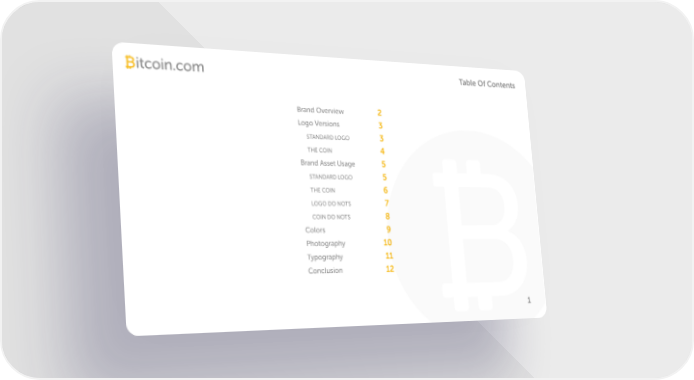 Bitcoin Brand Book Page 1 Page 3Table Of Contents Brand Overview 2 Logo Versions 3 STANDARD LOGO 3 THE COIN 4 Brand Asset Usage 5 STANDARD LOGO 5 THE COIN 6 LOGO DO NOTS 7 COIN DO NOTS 8 Colors 9 Photography 10 Typography 11 Conclusion 12 1