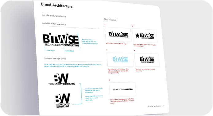 BITWISE INDUSTRIES 6 Sub-brands Guidance Brand Architecture Sub-brand Primary Logo Lockup Avenir Light Avenir Black Line of business name should be centered with wide or stacked text. Interchangeable use of icons depending on space constraints. When using the Sub-brand Icon, Bitwise Industries should be mentioned in text or Primary Bitwise Industries logo should be used along with the Sub-brand Icon. Line of business is right-aligned under the primary Bitwise wordmark. Sub-brand Icon Logo Lockup x Don’t stretch or manipulate the logo. x x x Don’t pair the logo with marks that may be confused as logos. Restricting use to only black or white affords us the highest contrast ratio, aiding accessibility. Don’t type out line of business in any other fonts. Not Allowed x Don’t use line of business (ex: Technology Consulting) without the Bitwise wordmark or icon.