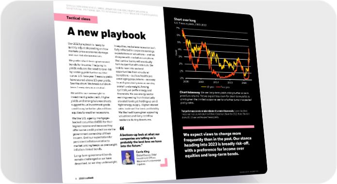 FOR PUBLIC DISTRIBUTION IN THE U.S., CANADA, LATIN AMERICA, HONGKONG, SINGAPORE AND AUSTRALIA. FOR INSTITUTIONAL, PROFESSIONAL, QUALIFIED INVESTORS AND QUALIFIED CLIENTS IN OTHER PERMITTED COUNTRIES. Short over long Tactical views U.S. Treasury yields, 2000-2022 7% A new playbook 6% 5% Our 2023 playbook is ready to In equities, we believe recession isn’t d4% quickly adjust depending on how fully reflected in corporate earnings Yiel markets price economic damage expectations or valuations –and we 3% and our risk stance evolves. disagree with market assumptions We prefer short-term government that central banks will eventually 2% bonds for income: The jump in turn supportive with rate cuts. We yields reduces the need to take risk look to lean into sectoral 1% by seeking yield further out the opportunities from structural curve. U.S. two-year Treasury yields transitions –such as healthcare 0% have soared above 10-year yields. amid aging populations –as a way 2000 2005 2010 2015 2020 See the chart. We break out short- to add granularity even as we stay overall underweight.Among 10-year Two-year term Treasuries as a neutral. cyclicals, we prefer energy and We add to our overweight to financials. We see energy sector Chart takeaway: We see long-term yields rising further as term investment grade credit. Higher earnings easing from historically premium returns. Yet we expect less room for short-term yields to yields and strong balance sheets elevated levels yet holding up amid climb given the limited scope we see for a further jump in expected suggest to us investment grade tight energy supply. Higher interest policy rates. credit may be better placed than rates bode well for bank profitability. equities to weather recessions. We like healthcare given appealing Past performance is not a reliable indicator of current or future results. Source: BlackRock valuations and likely cashflow Investment Institute, with data from Refinitiv Datastream, November 2022. Notes: The chart We like U.S. agency mortgage- resilience during downturns. shows U.S. 10-year and two-year Treasury yields. backed securities (MBS) for their higher income and because they offer some credit protection via the government ownership of their A bottom-up look at what our issuers. And our expectation for companies are telling us is We expect views to change more persistent inflation relative to probably the best lens we have frequently than in the past. Our stance market pricing keeps us overweight inflation-linked bonds. into the future.” heading into 2023 is broadly risk-off, Long-term government bonds Carrie King with a preference for income over remain challenged as we have Global Deputy Chief described, so we stay underweight. Investment Officer, equities and long-term bonds. Blackrock Fundamental Equities 88 2023 outlook 8 2022 midyear outlook BBIIIIMM1122U/M1222U/M--26121472617935--88/16/16