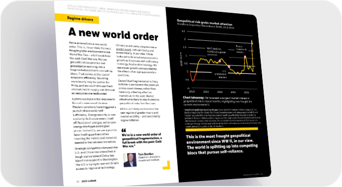 FOR PUBLIC DISTRIBUTION IN THE U.S., CANADA, LATIN AMERICA, HONGKONG, SINGAPORE AND AUSTRALIA. FOR INSTITUTIONAL, PROFESSIONAL, QUALIFIED INVESTORS AND QUALIFIED CLIENTS IN OTHER PERMITTED COUNTRIES. Geopolitical risk grabs market attention Regime drivers BlackRock Geopolitical Risk Indicator (BGRI), 2018-2022 2.5 A new world order 2 Russia 1.5 WHO declares invasionof We’ve entered into a new world China’s recent party congress was a COVID-19 a global Ukraine order. This is, in our view, the most pivotal event, both politically and e pandemic fraught global environment since economically, in our view. China Scor1 World War Two –a full break from looks set to de-emphasize economic RI the post-Cold War era. We see growth as it pursues self-sufficiency BG0.5 geopolitical cooperation and in energy, food and technology. We globalization evolving into a see slower growth compounded by 0 U.S. fragmented world with competing the effects of an aging population presidential blocs. That comes at the cost of over time. election economic efficiency. Sourcing -0.5 more locally may be costlier for Geopolitical fragmentation is likely firms, and we could also see fresh to foster a permanent risk premium -1 mismatches in supply and demand across asset classes, rather than 2018 2019 2020 2021 2022 as resources are reallocated. have only a fleeting effect on markets as in the past. Market Chart takeaway: We have seen a surge in market interest in A prime example is the response to attention is likely to stay fixated on geopolitical risk in recent months, highlighting how fraught the Russia’s invasion of Ukraine. geopolitical risks. See the chart. current environment is. Western sanctions have triggered a All this will likely contribute to the pursuit of economic self- Forward-looking estimates may not come to pass. Source: BlackRock Investment Institute. October 2022. The sufficiency. Energy security is now new regime of greater macro and BlackRock Geopolitical Risk Indicator (BGRI) tracks the relative frequency of brokerage reports (via Refinitiv) and market volatility – and persistently financial news stories (Dow Jones News) associated with specific geopolitical risks. We adjust for whether the a priority: As Europe weans itself higher inflation. sentiment in the text of articles is positive or negative, and then assign a score. This score reflects the level of market attention to each risk versus a five-year history. We use a shorter historical window for our COVID risk due to its off Russian oil and gas, we’ve seen energy shortages and higher limited age. We assign a heavier weight to brokerage reports than other media sources since we want to measure the prices. In the U.S., we see a push to market's attention to any particular risk, not the public’s. favor trading partners when sourcing the metals and materials We’re in a new world order of needed in the net-zero transition. geopolitical fragmentation, a This is the most fraught geopolitical full break with the post-Cold environment since WW II, in our view. Strategic competition between the War era.” The world is splitting up into competing U.S. and China has intensified. A tough stance toward China has Tom Donilon blocs that pursue self-reliance. bipartisan support in Washington. Chairman, BlackRock Investment Institute The U.S is trying to restrict China’s access to high-end technology. 11 2023 outlook 11 11 2022 midyear outlook BBIIIIMM1122U/M1222U/M--26121472617935--1111/16/16