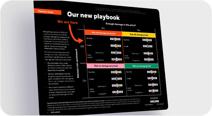 FOR PUBLIC DISTRIBUTION IN THE U.S., CANADA, LATIN AMERICA, HONGKONG, SINGAPORE AND AUSTRALIA. FOR INSTITUTIONAL, PROFESSIONAL, QUALIFIED INVESTORS AND QUALIFIED CLIENTS IN OTHER PERMITTED COUNTRIES. Tactical views Our new playbook We are here Enough damage in the price? No Yes Navigating markets in 2023 will Risk off, damage not priced Risk off, damage priced require more frequent portfolio changes. We see two assessments Equities Equities that determine tactical portfolio outcomes: 1) our assessment of market risk sentiment, and 2) our Off Credit Credit view of the economic damage reflected in market pricing. The matrix shows how we plan to Short term Short term change our views and turn more timent Govt. Govt. positive as markets play out in the n bonds bonds new regime. A few key conclusions: Long term Long term se • We are already at our most k defensive stance. Other options ris Risk on, damage not priced Risk on, damage priced are about turning more positive, especially on equities. et rk Equities Equities • We are underweight nominal long-term government bonds in Ma each scenario in this new regime. Credit Credit This is our strongest conviction in On any scenario. • We can turn positive in different Short term Short term ways: either via our assessment of Govt. Govt. market risk sentiment or our view bonds bonds on how much damage is in the Long term Long term price. Past performance is not a reliable indicator of current or future results. It is not possible to invest directly in an index. Sources: Blackrock Investment Institute, November 2022. Notes: The boxes in this Tactical view stylized matrix show how our tactical views on broad asset classes would switch if we were to change our assessment of market risk sentiment or assessment of how much economic damage is priced in. The potential view changes are from a U.S. dollar perspective. This material represents an assessment of the market environment at a specific time and is not intended to be a forecast or guarantee of future results. This information should not be relied upon as investment advice regarding any particular fund, strategy or security. Underweight Overweight 44 2023 outlook 4 2022 midyear outlook BBIIIIMM1122U/M1222U/M--26121472617935--44/16/16
