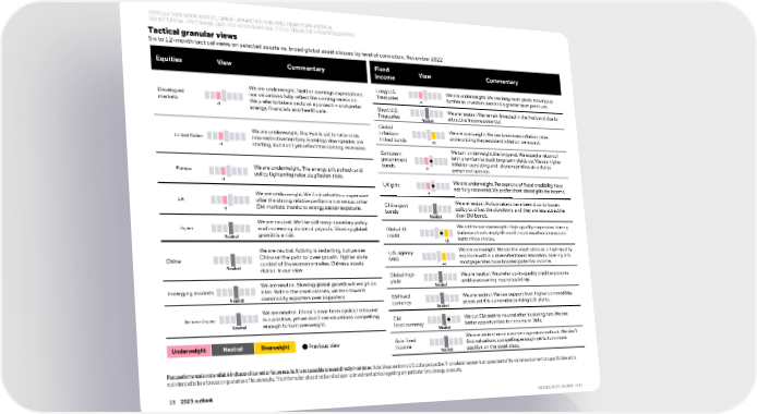 FOR PUBLIC DISTRIBUTION IN THE U.S., CANADA, LATIN AMERICA, HONGKONG, SINGAPORE AND AUSTRALIA. FOR INSTITUTIONAL, PROFESSIONAL, QUALIFIED INVESTORS AND QUALIFIED CLIENTS IN OTHER PERMITTED COUNTRIES. Tactical granular views Six to 12-month tactical views on selected assets vs. broad global asset classes by level of conviction, November 2022 Equities View Commentary Fixed View Commentary income We are underweight. Neither earnings expectations Long U.S. We are underweight. We see long-term yields moving up Treasuries further as investors demand a greater term premium. Developed nor valuations fully reflect the coming recession. markets We prefer to take a sectoral approach – and prefer Short U.S. We are neutral. We remain invested in the front end due to energy, financials and healthcare. Treasuries attractive income potential. Global We are overweight. We see breakeven inflation rates We are underweight. The Fed is set to raise rates inflation- underpricing the persistent inflation we expect. United States into restrictive territory. Earnings downgrades are linked bonds starting, but don’t yet reflect the coming recession. European We turn underweight the long end. We expect a return of government term premium to push long-term yields up. We see higher bonds inflation persisting and sharp rate hikes as a risk to We are underweight. The energy price shock and peripheral spreads. Europe policy tightening raise stagflation risks. UK gilts We are underweight. Perceptions of fiscal credibility have not fully recovered. We prefer short-dated gilts for income. We are underweight. We find valuations expensive UK after the strong relative performance versus other China govt We are neutral. Policymakers have been slow to loosen DM markets thanks to energy sector exposure. bonds policy to offset the slowdown, and they are less attractive than DM bonds. We are neutral. We like still-easy monetary policy We add to our overweight. High-quality corporates’ strong Japan and increasing dividend payouts. Slowing global Global IG balance sheets imply IG credit could weather a recession growth is a risk. credit better than stocks. We are neutral. Activity is restarting, but we see U.S. agency We are overweight. We see the asset class as a high-quality China China on the path to lower growth. Tighter state MBS exposure within a diversified bond allocation. Soaring U.S. control of the economy makes Chinese assets mortgage rates have boosted potential income. riskier, in our view. Global high We are neutral. We prefer up-in-quality credit exposures We are neutral. Slowing global growth will weigh on yield amid a worsening macro backdrop. Emerging markets EMs. Within the asset classes, we lean toward commodity exporters over importers. EM hard We are neutral. We see support from higher commodities currency prices yet it is vulnerable to rising U.S. yields. We are neutral. China’s near-term cyclical rebound Asia ex-Japan is a positive, yet we don’t see valuations compelling EM We cut EM debt to neutral after its strong run. We see enough to turn overweight. local currency better opportunities for income in DMs. Underweight Neutral Overweight nPrevious view Asia fixed We are neutral amid a worsening macro outlook. We don’t income find valuations compelling enough yet to turn more positive on the asset class. Past performance is not a reliable indicator of current or future results. It is not possible to invest directly in an index. Note: Views are from a U.S. dollar perspective. This material represents an assessment of the market environment at a specific time and is not intended to be a forecast or guarantee of future results. This information should not be relied upon as investment advice regarding any particular fund, strategy or security. 15 15 2022 midyear outlook 15 2023 outlook BBIIIIMM1122U/M1222U/M--26121472617935--1515/16/16