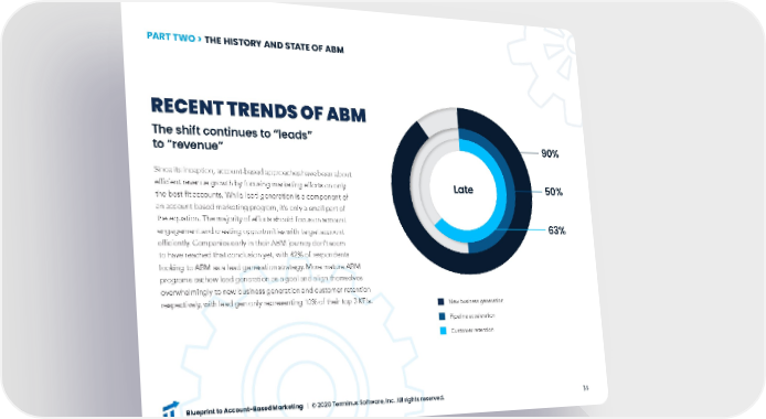 PART TWO > THE HISTORY AND STATE OF ABM RECENT TRENDS OF ABM The shift continues to “leads” 90% to “revenue” Since its inception, account-based approaches have been about efficient revenue growth by focusing marketing efforts on only Late 50% the best-fit accounts. While lead generation is a component of an account-based marketing program, it’s only a small part of the equation. The majority of efforts should focus on account 63% engagement and creating opportunities with target account efficiently. Companies early in their ABM journey don’t seem to have reached that conclusion yet, with 42% of respondents looking to ABM as a lead generation strategy. More mature ABM programs eschew lead generation as a goal and align themselves overwhelmingly to new business generation and customer retention respectively, with lead gen only representing 10% of their top 3 KPIs. New business generation Pipeline acceleration Customer retention Blueprint to Account-Based Marketing | © 2020 Terminus Software, Inc. All rights reserved. 14