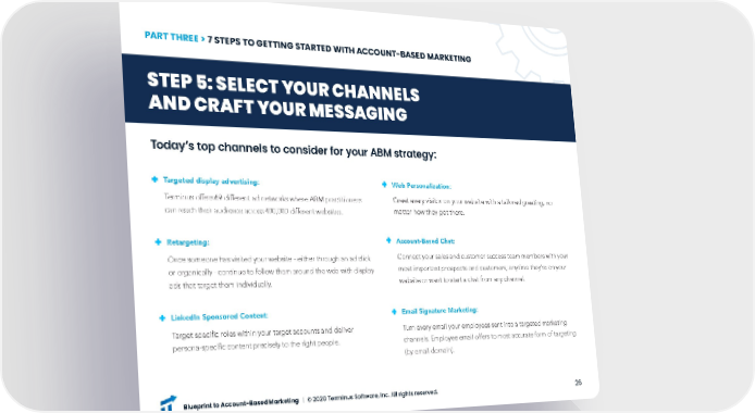 PART THREE > 7 STEPS TO GETTING STARTED WITH ACCOUNT-BASED MARKETING STEP 5: SELECT YOUR CHANNELS AND CRAFT YOUR MESSAGING Today’s top channels to consider for your ABM strategy: Targeted display advertising: Web Personalization: Terminus offers 69 different ad networks where ABM practitioners Greet every visitor on your website with a tailored greeting, no can reach their audience across 400,000 different websites. matter how they got there. Retargeting: Account-Based Chat: Once someone has visited your website - either through an ad click Connect your sales and customer success team members with your or organically - continue to follow them around the web with display most important prospects and customers, anytime they’re on your ads that target them individually. website or want to start a chat from any channel. LinkedIn Sponsored Content: Email Signature Marketing: Target specific roles within your target accounts and deliver Turn every email your employees sent into a targeted marketing persona-specific content precisely to the right people. channels. Employee email offers to most accurate form of targeting (by email domain). Blueprint to Account-Based Marketing | © 2020 Terminus Software, Inc. All rights reserved. 26