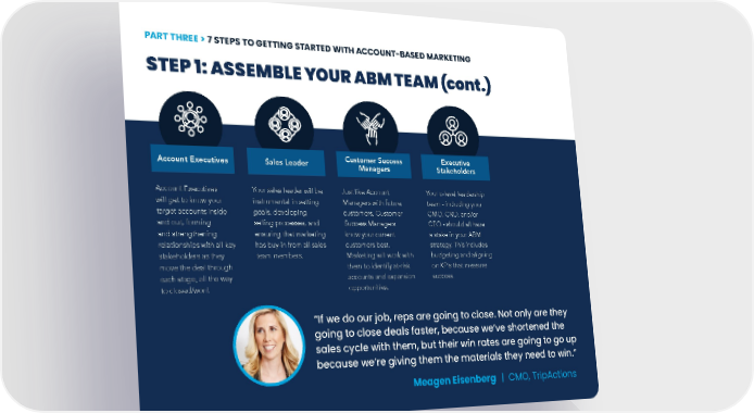 PART THREE > 7 STEPS TO GETTING STARTED WITH ACCOUNT-BASED MARKETING STEP 1: ASSEMBLE YOUR ABM TEAM (cont.) Account Executives Sales Leader Customer Success Executive Managers Stakeholders Account Executives Your sales leader will be Just like Account Your c-level leadership will get to know your instrumental in setting Managers with future team - including your target accounts inside goals, developing customers, Customer CMO, CRO, and/or and out, forming selling processes, and Success Managers CEO - should all have and strengthening ensuring that marketing know your current a stake in your ABM relationships with all key has buy-in from all sales customers best. strategy. This includes stakeholders as they team members. Marketing will work with budgeting and aligning move the deal through them to identify at-risk on KPIs that measure each stage, all the way accounts and expansion success. to closed/won! opportunities. “If we do our job, reps are going to close. Not only are they going to close deals faster, because we’ve shortened the sales cycle with them, but their win rates are going to go up because we’re giving them the materials they need to win.” Meagen Eisenberg | CMO, TripActions Blueprint to Account-Based Marketing | © 2020 Terminus Software, Inc. All rights reserved. 18