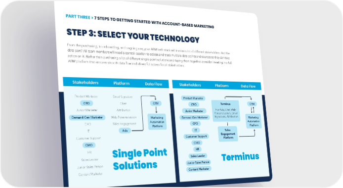 PART THREE > 7 STEPS TO GETTING STARTED WITH ACCOUNT-BASED MARKETING STEP 3: SELECT YOUR TECHNOLOGY From the purchasing, to onboarding, and ongoing use, your ABM tech stack will involve a lot of different stakeholders. And the data part? All team members will need a central location to access and track multiple data points and sources so they can take action on it. Rather than purchasing a lot of different single point solutions and taping them together, consider investing in a full ABM platform that ensures smooth data flow and allows full access for all stakeholders. Stakeholders Platform Data Flow Stakeholders Platform Data Flow Product Marketer Email Signature Product Marketer CRO Chat CRM CRO Terminus CRM Junior Marketer Attribution Junior Marketer For Ads, Chat, Web Personalization, Email Demand Gen Marketer Web Personalization Marketing Demand Gen Marketer Signatures, Attribution Marketing CFO Sales Engagement Automation CFO Automation Platform Platform IT Ads IT Sales Customer Support Customer Support Engagement Platform CMO CMO HR Single Point HR Sales Leader Sales Leader Terminus Junior Sales Person Solutions Junior Sales Person Content Marketer Content Marketer Blueprint to Account-Based Marketing | © 2020 Terminus Software, Inc. All rights reserved. 22