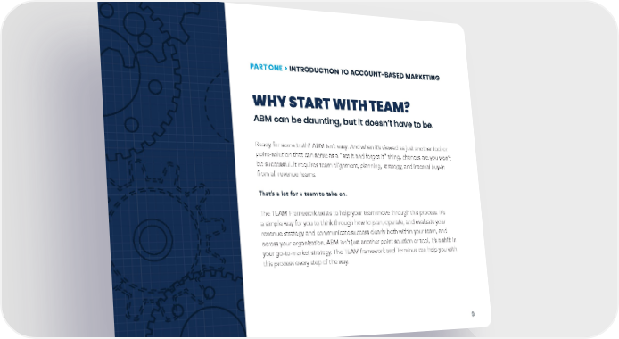 PART ONE > INTRODUCTION TO ACCOUNT-BASED MARKETING WHY START WITH TEAM? ABM can be daunting, but it doesn’t have to be. Ready for some truth? ABM isn’t easy. And when it’s viewed as just another tool or point-solution that can serve as a “set it and forget it” thing, chances are you won’t be successful. It requires team alignment, planning, strategy, and internal buy-in from all revenue teams. That’s a lot for a team to take on. The TEAM Framework exists to help your team move through this process. It’s a simple way for you to think through how to plan, operate, and evaluate your revenue strategy and communicate success clearly both within your team, and across your organization. ABM isn’t just another point solution or tool, it’s a shift in your go-to-market strategy. The TEAM framework and Terminus can help you with this process every step of the way. Blueprint to Account-Based Marketing | © 2020 Terminus Software, Inc. All rights reserved. 9