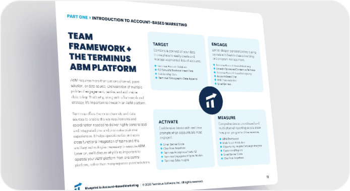 PART ONE > INTRODUCTION TO ACCOUNT-BASED MARKETING TEAM TARGET ENGAGE Earlier, deeper penetration into buying FRAMEWORK + Combine & connect all your data centers with best-in-class advertising in one place to easily create and and program management. THE TERMINUS manage segmented lists of accounts. Terminus Account-Based Advertising Terminus Account Database LinkedIn Sponsored Content via Terminus ABM PLATFORM G2 Crowd & Bombora Intent Data Terminus Account-Based Retargeting Relationship Data Account-Based Chat Terminus Firmographic Data Append Web Personalization ABM requires more than just one channel, point Email Banners solution, or data source. Orchestration of multiple points of engagement, tactics, and actionable data is key. That’s why, along with a framework and strategy, it’s important to invest in an ABM platform. Terminus offers the most channels and data MEASURE sources to enable the key requirements and ACTIVATE coordination needed to deliver highly personalized Comprehensive account-based and and integrated pre- and post-sales customer Enable sales teams with real time multi-channel reporting so you know experiences. It helps operationalize and scale prompts when accounts are most how your programs drive revenue. cross-functional integration of teams and the engaged. ABM Dashboard ancillary technologies necessary to execute ABM. Email Banner Clicks Multi-Touch Attribution Later on, we’ll discuss why it’s so important to Chat from Anywhere Opportunity Insights Campaign Analytics Terminus Anonymous Visitor ID Customized Reports operate your ABM platform from one central Terminus Engagement Spike Models Email Banner Clicks platform, rather than many separate point solutions. Terminus Sales Insights Chat from Anywhere Blueprint to Account-Based Marketing | © 2020 Terminus Software, Inc. All rights reserved. 10