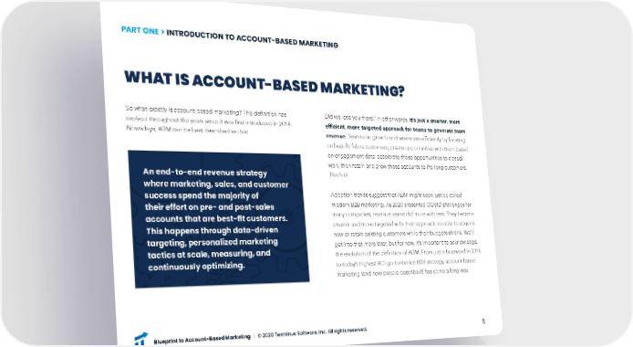 PART ONE > INTRODUCTION TO ACCOUNT-BASED MARKETING WHAT IS ACCOUNT-BASED MARKETING? So what exactly is account-based marketing? The definition has Did we lose you there? In other words, it’s just a smarter, more evolved throughout the years since it was first introduced in 2014. efficient, more targeted approach for teams to generate more Nowadays, ABM can be best described as this: revenue. Teams can grow brand awareness efficiently by focusing on best-fit future customers, create opportunities with them based on engagement data, accelerate those opportunities to closed/ won, then retain and grow those accounts to life-long customers. An end-to-end revenue strategy That’s it! where marketing, sales, and customer success spend the majority of Adoption trends suggest that ABM might soon just be called their effort on pre- and post-sales modern B2B marketing. As 2020 presented COVID challenges for accounts that are best-fit customers. many companies, revenue teams did more with less. They became This happens through data-driven smarter and more targeted with their approach in order to acquire targeting, personalized marketing new or retain existing customers while their budgets shrank. We’ll tactics at scale, measuring, and get into that more later, but for now, it’s important to acknowledge the evolution of the definition of ABM. From just a buzzword in 2014 continuously optimizing. to today’s highest ROI go-to-market B2B strategy, account-based marketing (and how people describe it) has come a long way. Blueprint to Account-Based Marketing | © 2020 Terminus Software, Inc. All rights reserved. 5
