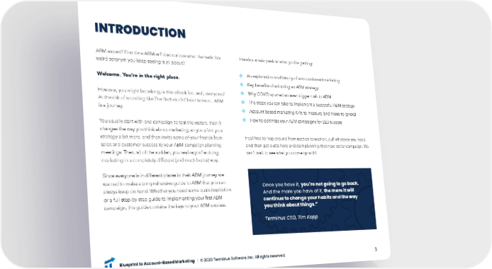 INTRODUCTION ABM expert? First time ABM-er? Just curious what the heck this Here’s a sneak peek at what you’re getting: weird acronym you keep seeing is all about? Welcome. You’re in the right place. An explanation and history of account-based marketing Key benefits of adopting an ABM strategy However, you might be asking, is this eBook for...well, everyone? Why COVID spurred an even bigger rush to ABM At the risk of sounding like The Bachelor’s Chris Harrison...ABM The steps you can take to implement a successful ABM strategy is a journey. Account-based marketing KPIs to measure (and those to ignore) You usually start with one campaign to test the waters, then it How to optimize your ABM campaigns for B2B success changes the way you think about marketing, so you pivot your strategy a bit more, and then invite some of your friends from Feel free to hop around from section to section, pull whatever you need, sales and customer success to your ABM campaign planning and then get outta here and start planning that next stellar campaign. We meetings. Then, all of the sudden, you realize you’re doing can’t wait to see what you come up with! marketing in a completely different (and much better) way. Since everyone is in different places in their ABM journey, we wanted to make a comprehensive guide to ABM that you can Once you have it, you’re not going to go back. always keep on-hand. Whether you need some quick inspiration And the more you have of it, the more it will or a full step-by-step guide to implementing your first ABM continue to change your habits and the way campaign, this guide contains the keys to your ABM success. you think about things.” Terminus CEO, Tim Kopp Blueprint to Account-Based Marketing | © 2020 Terminus Software, Inc. All rights reserved. 3