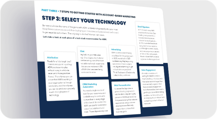 PART THREE > 7 STEPS TO GETTING STARTED WITH ACCOUNT-BASED MARKETING STEP 3: SELECT YOUR TECHNOLOGY Email Signature By now you know the name of the game with ABM: understanding exactly who your most A 1:1 channel–every ABM likely future customers are and then deploying an immersive and personalized end-to-end practitioner’s true love. Eye- tracking tests prove that a buyer experience for them. The only way to do that? A smart tech stack. branded email signature Let’s take a look at each piece of a tech stack recommended for ABM: attracts the most eyeballs , so it’s no wonder brands are using that hot real estate to Advertising put the right content, events, Chat and company announcements With in-person events taking in front of the right people. Say hello to your new sales a backseat for the greater part How’s it done? With an email Attribution rep. Chat (especially chatbots) of 2020, nearly half of B2B signature marketing platform! Ready for a little tough love? are becoming one of the most marketers say they’re pouring There is zero point in putting valuable techstack investments even more of their budgets ABM practices into play that you can make–with 85% into digital advertising to get without a way to attribute of B2B chat use cases being in front of more prospects. Sales Engagement revenue to those practices. attributed to sales. Think: Paid search, Display ads, A modern marketer isn’t Period. The only way you can LinkedIn Ads, and more. waiting for leads to come in - prove that ABM is working in they’re working in lockstep with your organization is through CRM/Marketing their sales teams to target their attribution, and the only way Automation Web Personalization most wanted prospects. And you can do attribution properly Gone are the days when a there are sales engagement is with the right piece of You need a single source of tools that are absolute musts to technology. truth for your customers, and generic landing page would nab the demo request. Eighty get this job done–We’re talking a reliable way to continue to analytics, real time alerts, and nurture them in every stage percent of B2B businesses say that personalizing their website an easy way to put relevant and of the funnel. But careful–the compelling content in front of ABM use case for automation experiences using customer data has more effectively accounts. doesn’t include batch and blast. Those days are very over. helped them achieve their business goals. Blueprint to Account-Based Marketing | © 2020 Terminus Software, Inc. All rights reserved. 20