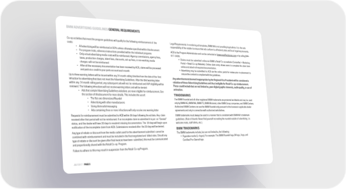 BMW ADVERTISING GUIDELINES GENERAL REQUIREMENTS Co-op activitiesthatmeettheprogramguidelines will qualifyforthefollowingreimbursementof the Legal Requirements: In rendering ad templates, BMW NA is not providing legal advice. It is the sole costs: responsibility of the retailer to ensure that ads conform to all federal, state and local legalrequirements. • All advertising will be reimbursed at 50% unless otherwise specified within thisdocument ACBistheProgramAdministratorandcanbecontactedat [email protected] • For program trials, reference instructions provided within the individual programs 617-5499. • Only actual advertising media costs will be reimbursed. Agency commissions, agency fees, • Claims must be submitted online via BMW9s Retail Co-op website (CenterNet > Marketing taxes, production charges, talent fees, discounts, set-up fees, or non-working media Portal > Retail Co-op Website). Online claim entry allows users to complete the claim form charges will not bereimbursed onlineandattachallrequireddocumentation. • After all the necessary documentation has been received by ACB, claims will be processed • Advertising may be submitted to ACB via the online portal for review prior to placement to andpaidviaacredittoyourpartsaccounteachmonth ensurethecontentiscompliantwiththeguidelines. Up to three warning letters will be issued within any 24 month rolling timeline from the date of the first Any advertisement deemed inappropriate by the Regional Vice President will be considered a infraction for advertising that does not meet the Advertising Guidelines. After the third warning letter violation of these Advertising Guidelines and thus ineligible for Retail Co-op reimbursement. within any 24 month rolling period, any subsequent ads will not be reimbursedand AVP eligibility will be These could include but are not limited to, poor digital graphic elements, audio quality, or use of reviewed. The following infractions will not receive warning letters and will bedenied: animation. • Ads that contain Advertising Guidelines violations are never eligible for reimbursement. See the section of thisdocument for more details. This includes the useof: TRADEMARKS • The flat-one dimensionalRoundel The BMW Roundel and all other registered BMW trademarks are protected worldwide and may be used • Advertising with othermanufacturers only by BMW AG, BMW NA, BMW FS, BMW Motorrad, other BMW Group companies, and BMWCenters. • Using distressfulmessaging AuthorizedBMWCenterscanusetheBMWRoundelonlypursuanttothelicensesin applicable dealer • Ads containing three or more infractions will only receive one warning letter agreements and only in connection with authorized vehiclelines. Requests for reimbursement must be submitted to ACB within 90 days following the ad date. Any claim BMW trademarks must always be used in a manner that is consistent with BMW NA9s trademark received after that period will not be reimbursed. If an incomplete claim is submitted it is put on