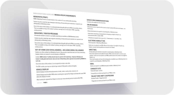 BMW ADVERTISING GUIDELINES MEDIUM-SPECIFIC REQUIREMENTS NEWSPAPER(PRINT) SERVICE DRIVEBANNER/ADVERTISING BMW9s Marketing Central can assist dealers in the creation of Co-op reimbursableadvertising. Compliant ads hung/placed in the servicedrive. Dealers may also create their own newspaper advertising. All new vehicle print materials are required to use ONLINEBANNERS photography on MarketingCentral. Online banner ads are required to direct users to a dealer9s website URL listed on the bmwusa. com Due to the nature of this medium, it is anticipated advertising will spill into the PMA of surrounding dealers. dealerlocator. This is acceptable as long as the medium9s primary coverage area is in the dealer9s PMA requesting All new online banners are required to use photography on Marketing Central. reimbursement. = Online banner advertising, including behavioral retargeting, is eligible for Retail Co-op MAGAZINES, THEATERPROGRAMS reimbursement within a dealer9sDMA. All materials needed to create Co-op eligible advertising are available on BMW Marketing Central. CTA buttons are required to be on your ad. (i.e.