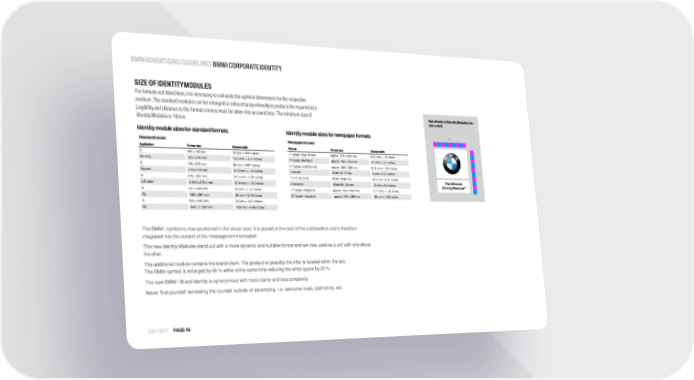 BMWADVERTISINGGUIDELINESBMWiCORPORATEIDENTITY SIZE OF IDENTITYMODULES For formats not listed here, it is necessary to calculate the optimal dimensions for the respective medium.Thestandard modulescanbeenlargedorreducedproportionallytoproducetherequired size. Legibility and distance to the format corners must be taken into account here. The minimum size of Sub-divisionofIdentityModulesinto Identity Modules is 16mm. size unitsX Identitymodulesizesforstandardformats Identitymodulesizesfornewspaperformats 9X Standardformats Newspaperformats Application Formatsize Modulewidth Format Formatsize Modulewidth A 105 x 148 mm 16 mm = 0.63 inches 1/1 page, large format approx. 370 x 520 mm 48.5 mm = 1.9 inches 6 A6 long 105 x 210 mm 19.5 mm = 0.77 inches 1/1 page, standard approx. 300 x 450 mm 41 mm = 1.61 inches A 148 x 210 mm 22 mm = 0.87 inches 1/1 page, small format approx. 220 x 320 mm 31.5 mm = 1.24 inches 5 10 X Square 210 x 210 mm 31.5 mm = 1.24 inches 1 column Width 45-70 mm 8 mm = 0.31 inches A 210 x 297 mm 31.5 mm = 1.24 inches 1 or 2 columns Width 70-90 mm 10.5 mm = 0.41 inches 4 US letter 215.9 x 279.4 mm 31.5 mm = 1.24 inches 2 columns Width 90-120 mm 15 mm = 0.6 inches A 297 x 420 mm 39 mm = 1.53 inches 1/1 page, magazine approx. 220 x 280 mm 31.5 mm = 1.24 inches 3 A2 420 x 594 mm 55 mm = 2.16 inches 2/1 page, magazine approx. 440 x 280 mm 39 mm = 1.53 inches A 594 x 840 mm 78 mm = 3.07 inches 1 A0 840 x 1,188 mm 126 mm = 4.96 inches TheBMWisymbolisnowpositionedinthevisualarea.Itisplacedatthestartofthe subheadline andis therefore integrated into the context of the messagecommunicated. ThenewIdentityModulesstandoutwith amoredynamic andsuitableformatandare now usedas aunit with one above theother. Theadditional module contains the brand claim.The productor possiblythe offeris located within the text. TheBMWsymbolisenlargedby66%whileatthesametimereducingthewhitespaceby23%. The new BMW i Brand Identity is synonymous with more clarity and lesscomplexity. Never find yourself recreating the roundel outside of advertising. i.e. welcome mats, staff shirts, etc. JULY 2017 PAGE46