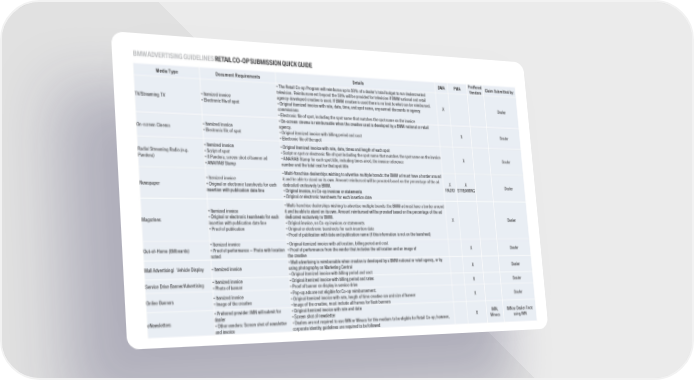 BMWADVERTISINGGUIDELINESRETAILCO-OPSUBMISSIONQUICK GUIDE Media Type Document Requirements Details DMA PMA Preffered Claim Submitted by: Vendors ▪ The Retail Co-op Program will reimburse up to 50% of a dealer9s total budget to run dealercreated television. Reimbursement beyond the 50% will be provided for television if BMW national and retail TV/Streaming TV ▪ Itemized invoice agency-developed creative is used. If BMW creative is used there is no limit to what can be reimbursed. X Dealer ▪ Electronic file of spot ▪ Original itemized invoice with rate, date, time, and spot name, any earned discounts or agency commissions ▪ Electronic file of spot, including the spot name that matches the spot name on the invoice ▪ On-screen cinema is reimbursable when the creative used is developed by a BMW national or retail On-screen Cinema ▪ Itemized invoice agency. X Dealer ▪ Electronic file of spot ▪ Original itemized invoice with billing period and cost ▪ Electronic file of the spot ▪ Itemized invoice ▪ Original itemized invoice with rate, date, times and length of each spot Radio/ Streaming Radio (e.g. ▪ Script of spot ▪ Script or spot or electronic file of spot including the spot name that matches the spot name on the invoice X Dealer Pandora) ▪ If Pandora, screen shot of banner ad ▪ ANA/RAB Stamp for each spot title, including times aired, the invoice reference ▪ ANA/RAB Stamp number and the total cost for that spot title ▪ Multi-franchise dealerships wishing to advertise multiple brands: the BMW ad must have a border around ▪ Itemized invoice it and be able to stand on its own. Amount reimbursed will be prorated based on the percentage of the ad X X Newspaper ▪ Original or electronic tearsheets for each dedicated exclusively to BMW. RADIO STREAMING Dealer insertion with publication date line ▪ Original invoice, no Co-op invoices or statements ▪ Original or electronic tearsheets for each insertion date ▪ Multi-franchise dealerships wishing to advertise multiple brands: the BMW ad must have a border around ▪ Itemized invoice it and be able to stand on its own. Amount reimbursed will be prorated based on the percentage of the ad Magazines ▪ Original or electronic tearsheets for each dedicated exclusively to BMW. X Dealer insertion with publication date line ▪ Original invoice, no Co-op invoices or statements ▪ Proof of publication ▪ Original or electronic tearsheets for each insertion date ▪ Proof of publication with date and publication name (if this information is not on the tearsheet) ▪ Itemized invoice ▪ Original itemized invoice with ad location, billing period and cost Out-of-Home (Billboards) ▪ Proof of performance 3Photo with location ▪Proof of performance from the vendor that includes the ad location and an image of X Dealer noted the creative ▪ Mall advertising is reimbursable when creative is developed by a BMW national or retail agency, or by Mall Advertising/ Vehicle Display ▪ Itemized invoice using photography on Marketing Central X Dealer ▪ Original itemized invoice with billing period and cost Service Drive Banner/Advertising ▪ Itemized invoice ▪ Original itemized invoice with billing period and rates X Dealer ▪ Photo of banner ▪ Proof of banner on display in service drive ▪ Pop-up ads are not eligible for Co-op reimbursement. ▪ Itemized invoice Online Banners ▪ Original itemized invoice with rate, length of time creative ran and size of banner X Dealer ▪ Image of the creative ▪ Image of the creative, must include all frames for flash banners ▪ Preferred provider: IMN will submit for ▪ Original itemized invoice with rate and date eNewsletters dealer ▪ Screen shot of newsletter X IMN, IMN or Dealer if not JULY 2017 PAGE17 ▪ Other vendors: Screen shot of newsletter ▪ Dealers are not required to use IMN or Minacs for this medium to be eligible for Retail Co-op; however, Minacs using IMN and invoice corporate identity guidelines are required to be followed