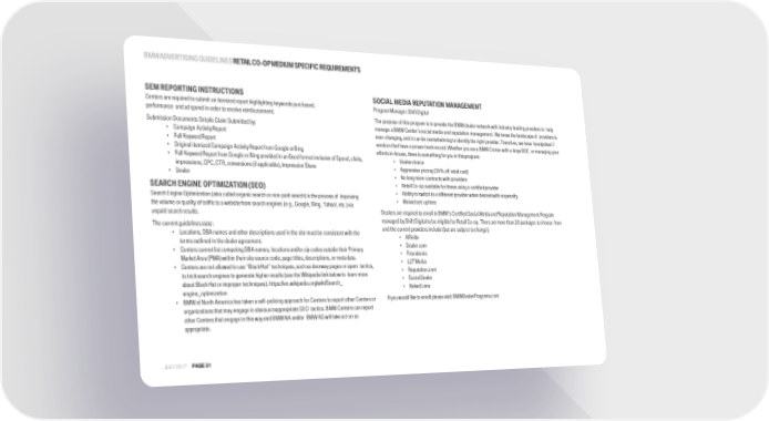 BMWADVERTISINGGUIDELINESRETAILCO-OPMEDIUM SPECIFIC REQUIREMENTS SEM REPORTINGINSTRUCTIONS SOCIAL MEDIA REPUTATIONMANAGEMENT Centers are required to submit an itemized report highlighting keywords purchased, Program Manager: ShiftDigital performance and ad spend in order to receivereimbursement. The purpose of this program is to provide the BMW dealer network with industry leading providers to help Submission Documents Details Claim Submittedby: manage a BMW Center9s social media and reputation management. We know the landscape of providers is • Campaign ActivityReport ever-changing, and it can be overwhelming to identify the right provider. Therefore, we have handpicked 7 • Full KeywordReport vendors that have a proven track record. Whether you are a BMW Center with a large BDC or managing your • Original itemized Campaign Activity Report from Google orBing efforts in-house, there is something for you in thisprogram: • Full Keyword Report from Google or Bing provided in an Excel format inclusive of Spend, clicks, • Dealerchoice impressions, CPC, CTR, conversions (if applicable), Impression Share • Aggressive pricing (35% off retailcost) • Dealer • No long-term contracts with providers SEARCH ENGINE OPTIMIZATION(SEO) • Retail Co-op available for those using a certifiedprovider Search Engine Optimization (also called organic search or non-paid search) is the process of improving • Ability to switch to a different provider when desired with nopenalty the volume or quality of traffic to a website from search engines (e.g., Google, Bing, Yahoo!, etc.) via • Waived set-upfees unpaid searchresults. Dealers are required to enroll in BMW9s Certified Social Media and Reputation Management Program The current guidelinesstate: managed by Shift Digital to be eligible for Retail Co-op. There are more than 20 packages to choose from • Locations, DBA names and other descriptions used in the site must be consistent with the and the current providers include (but are subject tochange): terms outlined in the dealeragreement. • Affinitiv • Centers cannot list competing DBA names, locations and/or zip codes outside their Primary • Dealer.com Market Area (PMA) within their site source code, page titles, descriptions, or metadata. • Friendemic • Centers are not allowed to use