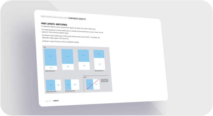 BMW ADVERTISINGGUIDELINES CORPORATE IDENTITY PRINT LAYOUTS -WHITESPACE If a dealership address or price communication appears, the layout must contain a white space. The relative proportions of visual to white space are variable, but the two elements are never of equal size: the purpose of this is to ensure a dynamic layout. The minimum share of white space is 20% and the minimum share of visual is 40%. The headline and subheadline always appear in the visual area. Landscape or square formats can also be subdivided vertically. JULY 2017 PAGE34