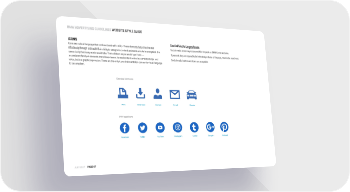 BMW ADVERTISINGGUIDELINES WEBSITE STYLE GUIDE ICONS Social MediaLogos/Icons Icons are a visual language that combine brand with utility. These elements help drive the user Socialmediaiconsmaynotexceed40x40pixelsonBMWCenterwebsites. effortlessly through a site with their ability to categorize content and communicate in one symbol the sameclaritythatmanywordswouldtake.Thinkofthem asyou wouldtypefonts4 If present,theyare requiredtobeinthebodyorfooterofthepage,neverinthemasthead. a consistent family of elements that allows viewers to read content online in a consistent style and Social media buttons as shown areacceptable. voice,butin a graphic expression.These aretheonlyicons dealerwebsitescan useforvisual language to becompliant. Standard BMWicons Print Download Contact Email Service BMW socialicons Facebook Twitter YouTube Instagram Tumblr Google+ Pinterest JULY 2017 PAGE67