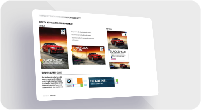 BMW ADVERTISINGGUIDELINES CORPORATE IDENTITY IDENTITY MODULES AND COPYPLACEMENT CURRENT PREVIOUS Required for Identity Moduleplacement. Recommended for headlineplacement. Recommended for body copy placement and subheadsize. BMW CI SQUARESGUIDE Size: Headline no bigger than the symbol module, no smaller than the additional module. Headline at least twice the size of thesubheadline. Between these, the size is variable and freelyscalable.Balance must be observed withthe other visualelements. JULY 2017 PAGE33