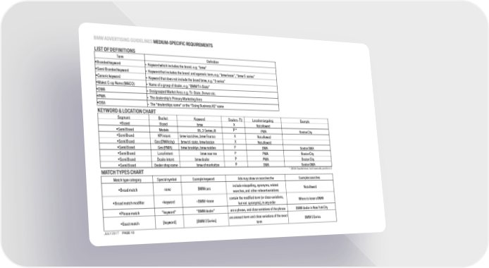 BMW Advertising Guidelines Page 11 Page 13BMW ADVERTISING GUIDELINES MEDIUM-SPECIFIC REQUIREMENTS LIST OFDEFINITIONS Term Definition •Brandedkeyword ▪ Keyword which includes the brand. e.g.