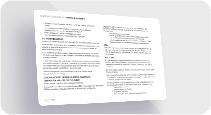 BMW ADVERTISING GUIDELINES GENERAL REQUIREMENTS • Word and letter marks. For example: BMW, Steptronic, M Power, iDrive, and Sports Activity Exceptions: The BMW logo and wordmark may appear with the logos and wordmarks of other ® manufacturers for billboards, parts-supply trucks, print, and automotive group websites with the Vehicle . • Numbers (also in combination with letters). For example: 750, 3 Series, M3, and X5. followingconditions: ® • Clear separation is required betweenlogos. • Advertising Slogans. For example: The Ultimate DrivingMachine . • ColorCombinations. Forexample:TheBMWMotorsportcolors. • Only DBA-specific information is permitted for BMW and other manufacturers. May • Special Distinguishing features. For example: the kidney-shapedgrilles. reference BMW affiliation with a specific dealer group only once in anad. DISTRESSED MESSAGING • In mediums where dealer-developed creative is eligible for Retail Co-Op, 50% or more of the content is required to highlight BMW products/features and current salesoffers. Aleaseprice,APRorMSRPmaynotbeusedinthe headline.Theonlyexceptiontothis ison bannerads. As consumers have access to invoice pricing on new vehicles, advertisements or messaging that contain PMA prices that are markedly below dealer invoice on such new vehicles hurts our brand image and also BMW NA has assigned to each Center, in writing, a geographic area consisting of a collection of zip constitutes distressedmessaging. code areas or census tracts, which shall be the Center9s PMA. The Center9s PMA isthe area in which a Center will primarily promote and sell BMW Vehicles. If you are unsure of yourPMA, please contact NOTE: The Advertising Guidelines concern only advertising practices and eligibility for AVP bonus funds. your AreaManager. They do not concern the pricing for vehicle sales, which are matters to be determined between dealers VIOLATIONS and individualconsumers. If a dealer was to engage in distressed messaging as defined in this communication, the procedure for Any advertisement deemed inappropriate by the Regional Vice President may be considered a notification of noncompliance that is set forth in the Advertising Guidelines will be utilized with the third violation of these Advertising Guidelines and place AVP and Retail Co-op reimbursement at risk. and subsequent notifications resulting in the dealer being ineligiblefor the Brand Standards portion of These reasons could include, but are not limited to, poor digital graphic elements, audio quality, or advertising bonus funds (currently 20%) for a three-month period. use ofanimation. Distressed messaging also includes use of third-party lead sources that utilize heavily- Warning letters will be issued in each case there is an infraction for advertising that does not meet the discounted/below-invoicemessaging. AdvertisingGuidelines. OTHER FRANCHISES OR MAKES IN DEALERADVERTISING Up to three warning letters will be issued within any 24 month rolling timeline from the date of the first infraction. After the third warning letter within any 24 month rolling period, any subsequent ads will not (NEW VEHICLE AND CERTIFIEDPRE-OWNED) be reimbursed and AVP eligibility will be reviewed. No other franchise or make is permitted, including websiteaddresses. The following infractions will not receive warning letters and will be denied. Ads that contain these If using a dealer9s URL in the ad, it is required to link only to a BMW exclusive dealer website that follows all Advertising Guidelines violations are never eligible for reimbursement. This includes the useof: BMW web standards (e.g., URL is dealer DBA name, no reference to other franchises,etc.). • The flat-one dimensionalRoundel • Advertising with othermanufacturers • Using distressfulmessaging • Ads containing three or more infractions will count as one infraction. JULY 2017 PAGE6