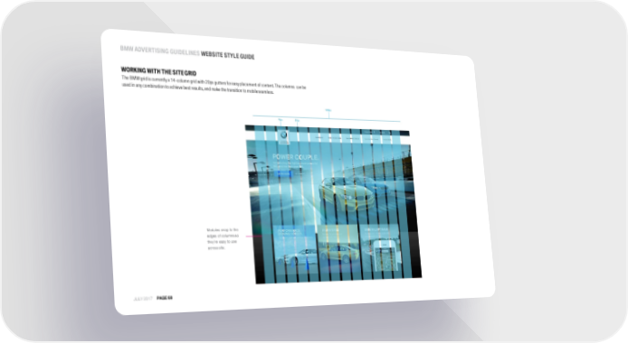 BMW ADVERTISINGGUIDELINES WEBSITE STYLE GUIDE WORKING WITH THE SITEGRID TheBMWgridiscurrentlya14-column gridwith20pxguttersforeasyplacementofcontent.Thecolumns can be used in any combination to achieve best results, and make the transition to mobileseamless. 1268px 72px 20px Modules snap to the edges of columnsso they’re easy to use acrosssite. JULY 2017 PAGE68