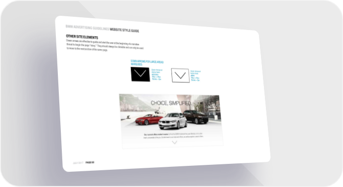BMW ADVERTISINGGUIDELINES WEBSITE STYLE GUIDE OTHER SITEELEMENTS Downarrows are effectivetoguideandalerttheuseratthebeginningofanarrative thread to begin the page