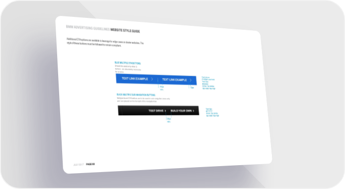 BMW ADVERTISINGGUIDELINES WEBSITE STYLE GUIDE Additional CTA options are available to leverage for edge cases on dealer websites. The styleofthesebuttonsmustbefollowedtoremaincompliant. BLUE MULTIPLE CTABUTTONS: Should be used only when 2 buttons are absolutely necessary for anarea. Text Linkon TEXT LINKEXAMPLE TEXT LINKEXAMPLE #1c69d3 colorfield Text12px #000000 25px 10px Arrow: 1px stroke min. 8px wide 14pxhigh BLACK MULTIPLE SUB-NAVIGATIONBUTTONS: Multiple black CTA buttons are to be used in sub-navigation areas only and are placed on the far right of the navigationbar. Text12px #FFFFFF Arrow: 3px stroke 6px wide 10pxhigh 25px min. JULY 2017 PAGE60