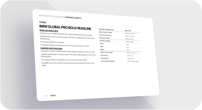 BMW ADVERTISINGGUIDELINES CORPORATE IDENTITY TYPEFACE BMWGLOBALPROBOLDHEADLINE HEADLINE /SUBHEADLINE BODYCOPY HEADLINEGUIDELINES BMW EFFICIENTDYNAMICS BMWEfficientDynamics Headlines are written in BMW Type Global Pro Bold. Settings for justification have tobe customized. BMWCONNECTEDDRIVE BMWConnectedDrive Headlines should be written in all caps and appear in 85% black on a light background or 100% white on BMWACTIVE HYBRID BMWActiveHybrid darkbackgrounds. EFFICIENTDYNAMICS EfficientDynamics Font size varies with different contenttypes. xDRIVE xDrive Thetrackingforheadlinesand subheadlines is-30to-45,the settingforkerningis