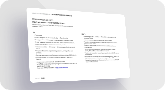 BMW ADVERTISING GUIDELINES MEDIUM-SPECIFIC REQUIREMENTS SOCIAL MEDIA DO’S ANDDON’TS CREATE AND MANAGE CONTENT FOR DEALERPAGES Your local Facebook, Instagram and Twitter handle provide you with the chance to promoteyour dealership to localfans. DO: DON’T: •PromoteBMW. •Explicitly identify yourself as an employee or affiliate of BMW on public pages (such asin •Think ―engagement and interest first, rather than ―offers, offers,offers. comments onFacebook) •Engaging positively on their dealer page to create a sense of community withcustomers. •Post anything that is damaging to the reputation of the brand on socialmedia •Promote local events: Local charity ties, sponsorships, civic ties, employee accolades,etc. •Post anything unless you have noted publicly on your profile that your views and contentare your own and notthat of BMW •Promote local offers: Sales, arrival of models onto your lot,incentives. •CommentonBMWcontentifitcanbe inferredfromyourprofilethatyouworkfororare •Give users seasonal tips: ―Winterize now! ―Maintenance suggestions for summerroad affiliated withBMW trips,etc. •Post commentary, content or images that are defamatory, pornographic, proprietary, •Take photos of new owners and post them to your channels, providing you have their harassing, libelous, or that can create a hostile workenvironment permission. •Promote or advertise local/dealer news and happenings on the national BMW USA channels •Encourageownersto postphotos oftheirnewcarontheirpage andtagtheBMWdealership. page on yourown. •Encourage customers to follow your channels and tag themselves in the photos on •Interact with other users on BMW USA content as an employee or affiliate of BMW, or at all if Facebook. it can be inferred from your profile that you are an employee or affiliate ofBMW •Ask open-ended questions to stimulate comments/conversation. •Reveal national event/promotional information before it has been announced by BMWUSA; please refer to MarketingCentral. •Let BMW USA know about major local happenings for consideration on a national level or for targeted regionalmessaging. You can reach BMW USA8s social team [email protected] JULY 2017 PAGE14