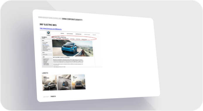BMW Advertising Guidelines Page 53 Page 55BMWADVERTISINGGUIDELINESBMWiCORPORATEIDENTITY 360°ELECTRIC INFO http://www.bmwusa.com/360electric LINKSTO JULY 2017 PAGE54